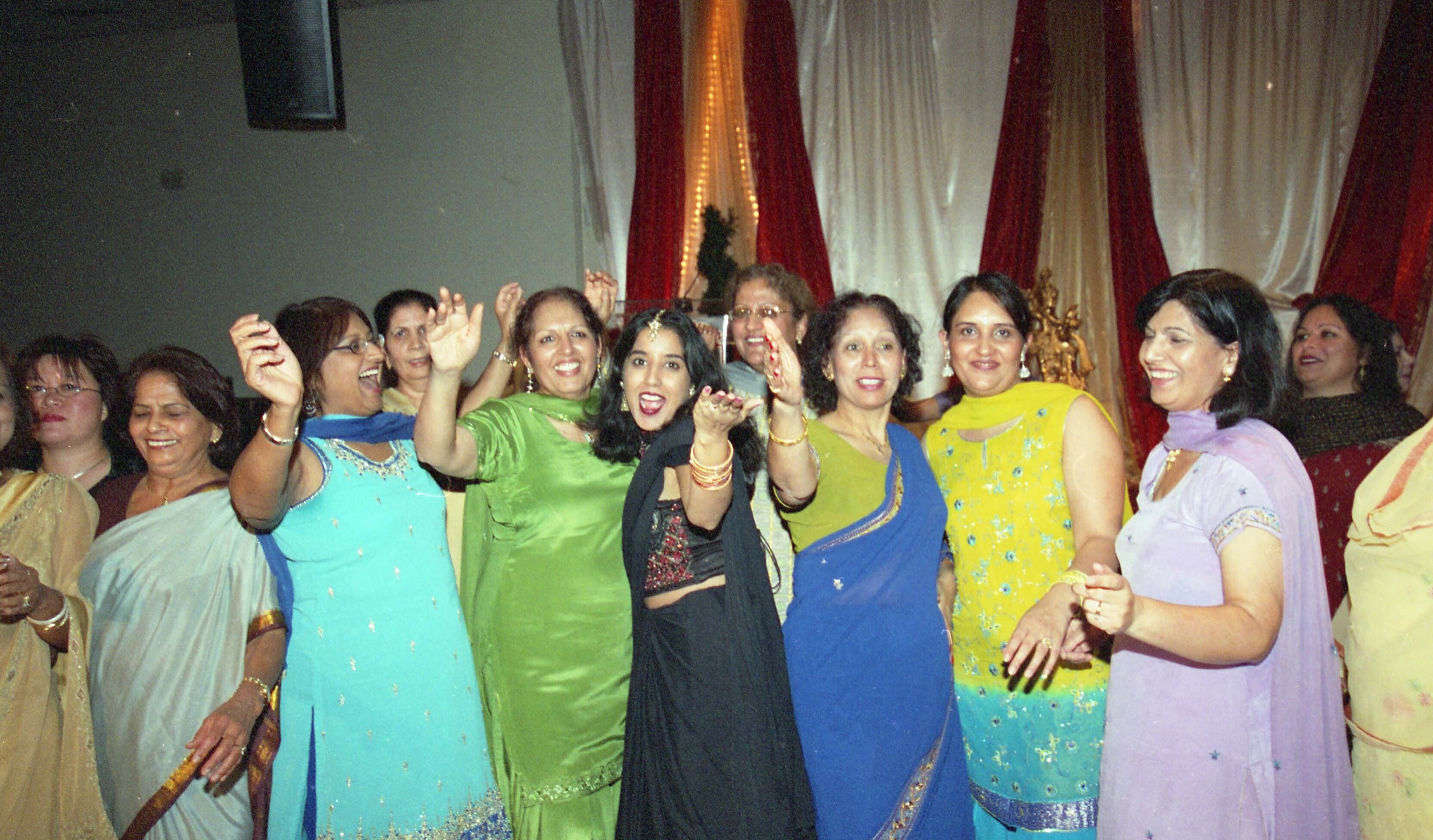 Photograph of unidentified women in cultural attire, celebrating by dancing at the South Asian Family Association fundraising event called "Deepmala", on October 22, 2004.