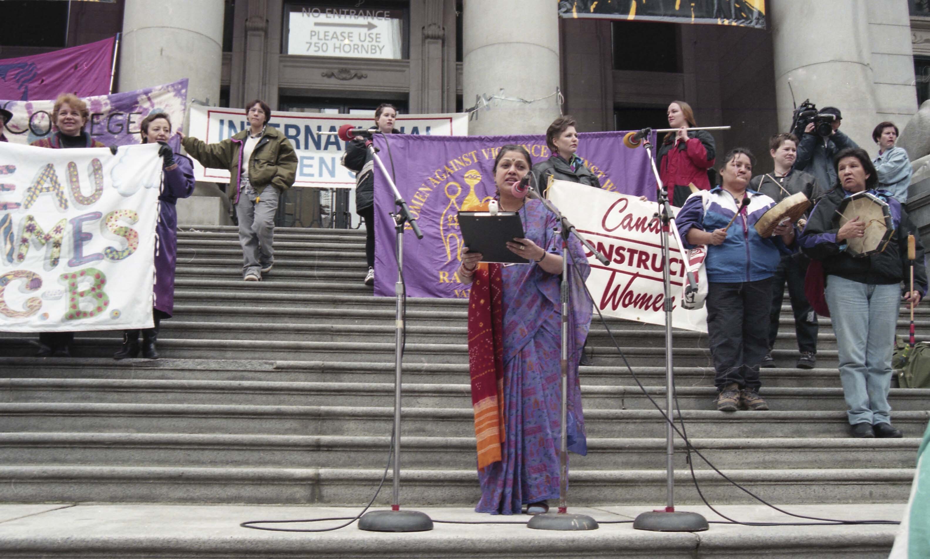 Photograph of an unidentified speaker outside the Vancouver Art Gallery for a rally pertaining to International Women's Day. The event took place in Vancouver, British Columbia (B.C.).