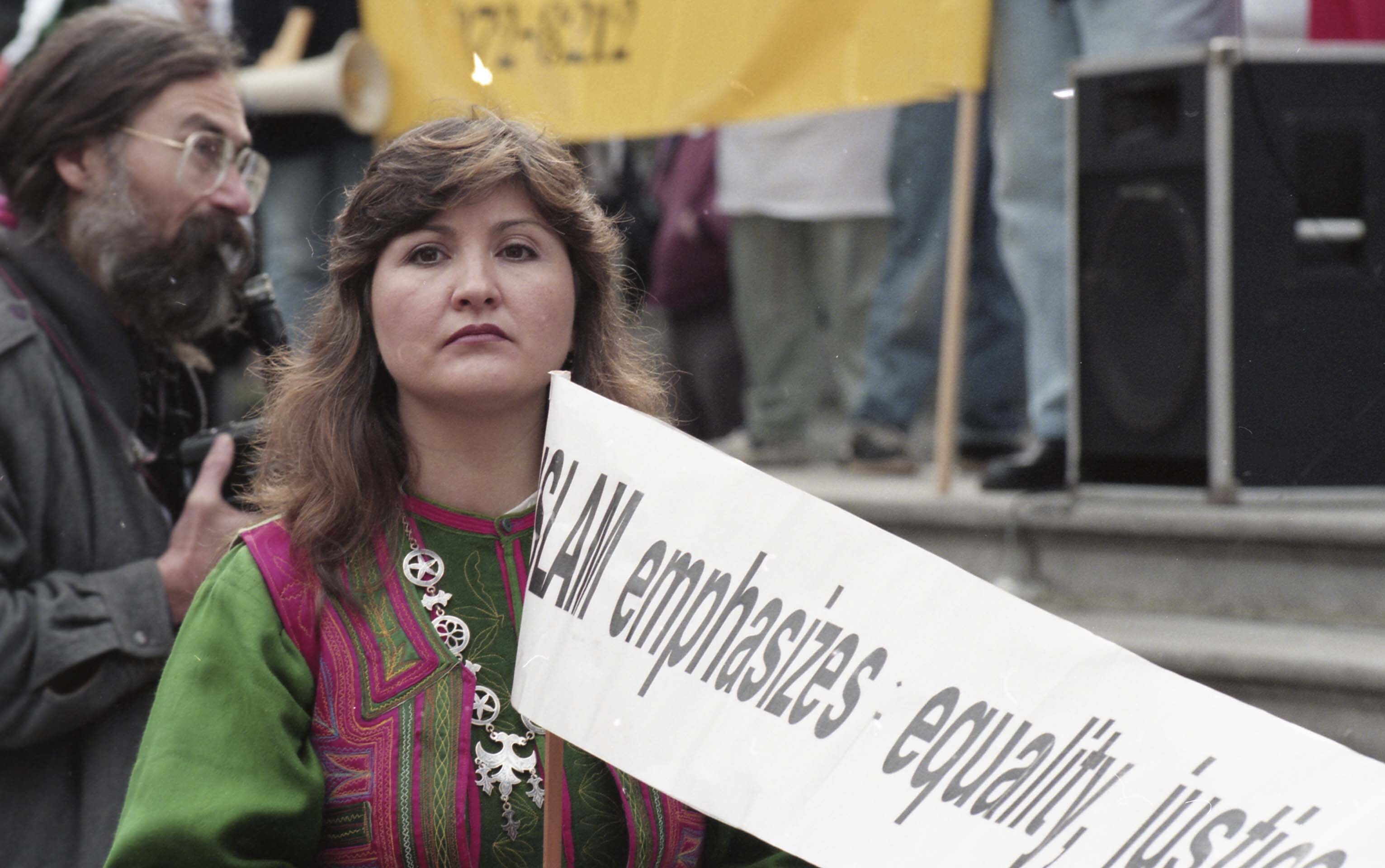 Photograph of an unidentified individual, holding a banner, outside the Vancouver Art Gallery for a rally pertaining to International Women's Day. The event took place in Vancouver, British Columbia (B.C.).