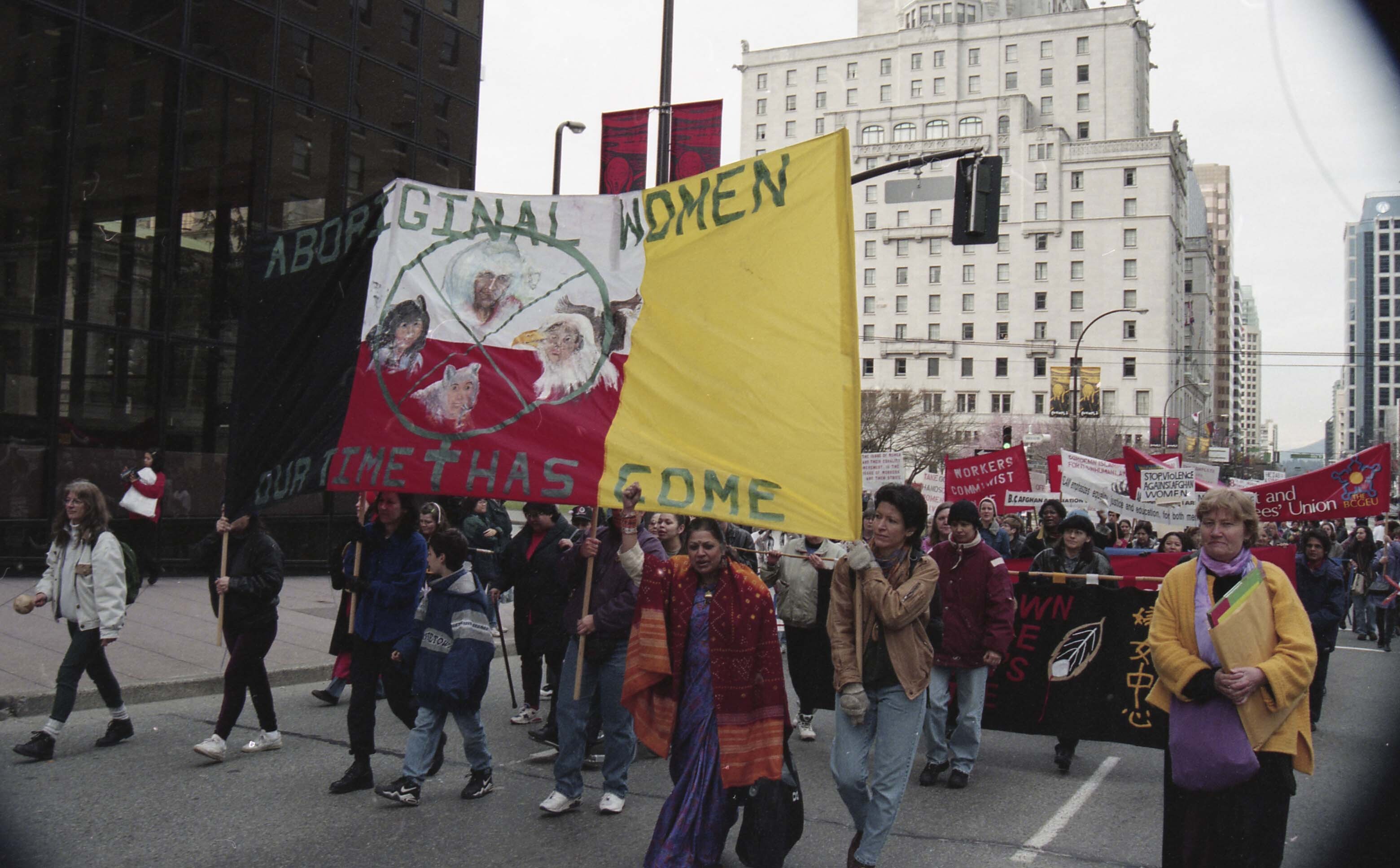 Photograph of a group of unidentified individuals, holding signs and banners, participating in the International Women's day parade which took place in Vancouver, British Columbia (B.C.).