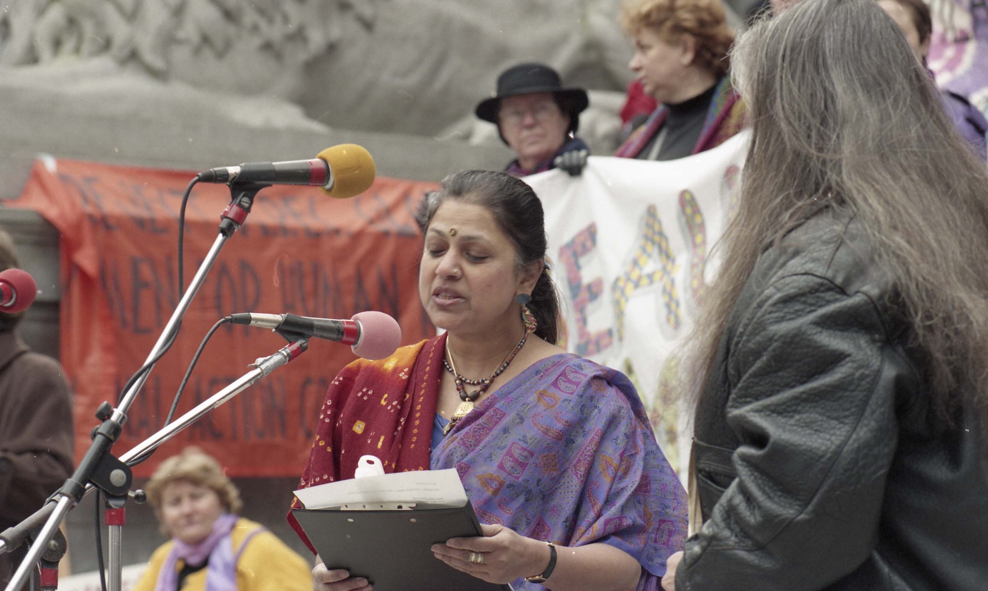 [Photograph of a speaker outside the Vancouver Art Gallery for International Women's Day]