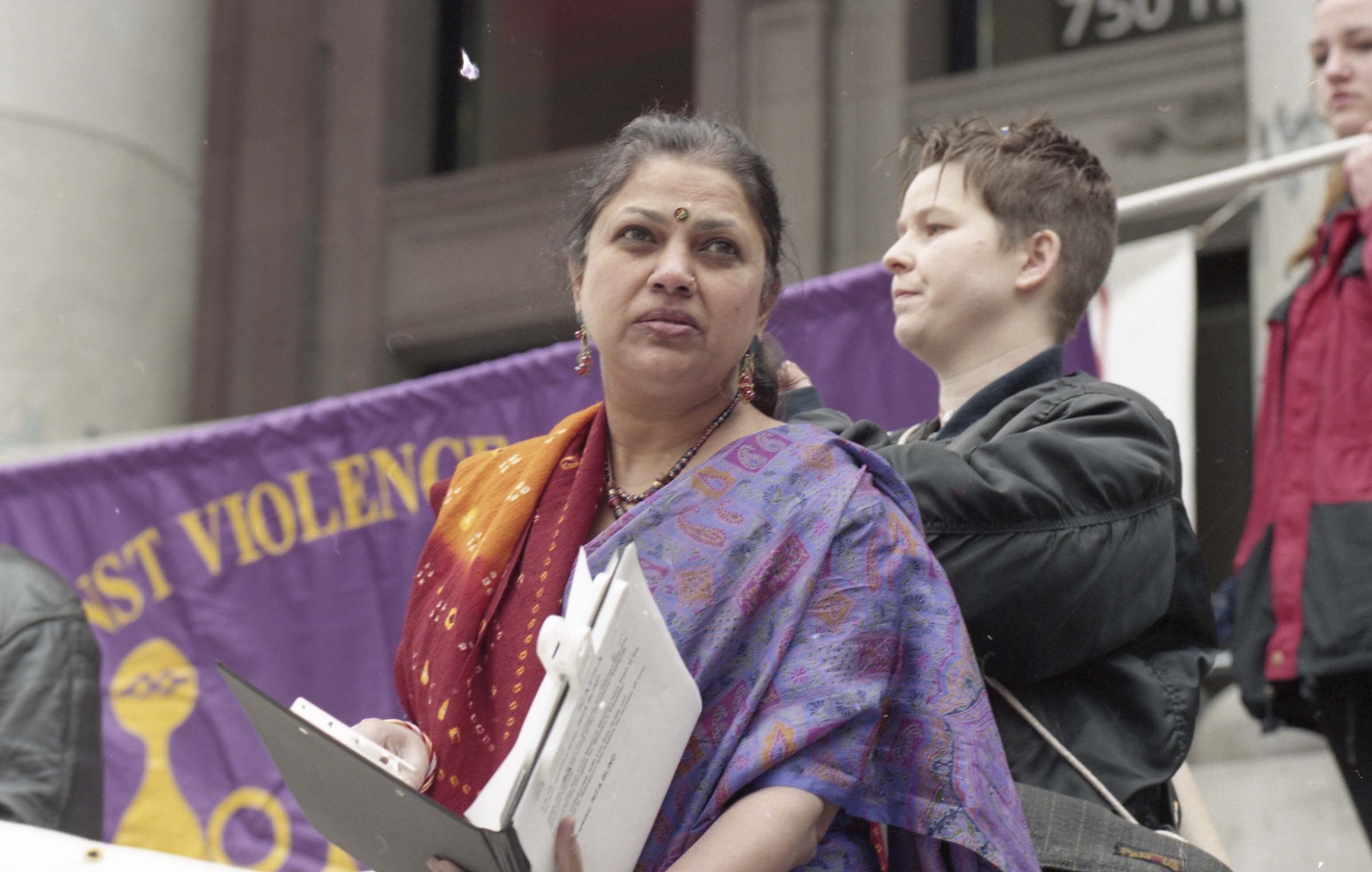Photograph of an unidentified individual outside the Vancouver Art Gallery for a rally pertaining to International Women's Day. The event took place in Vancouver, British Columbia (B.C.).