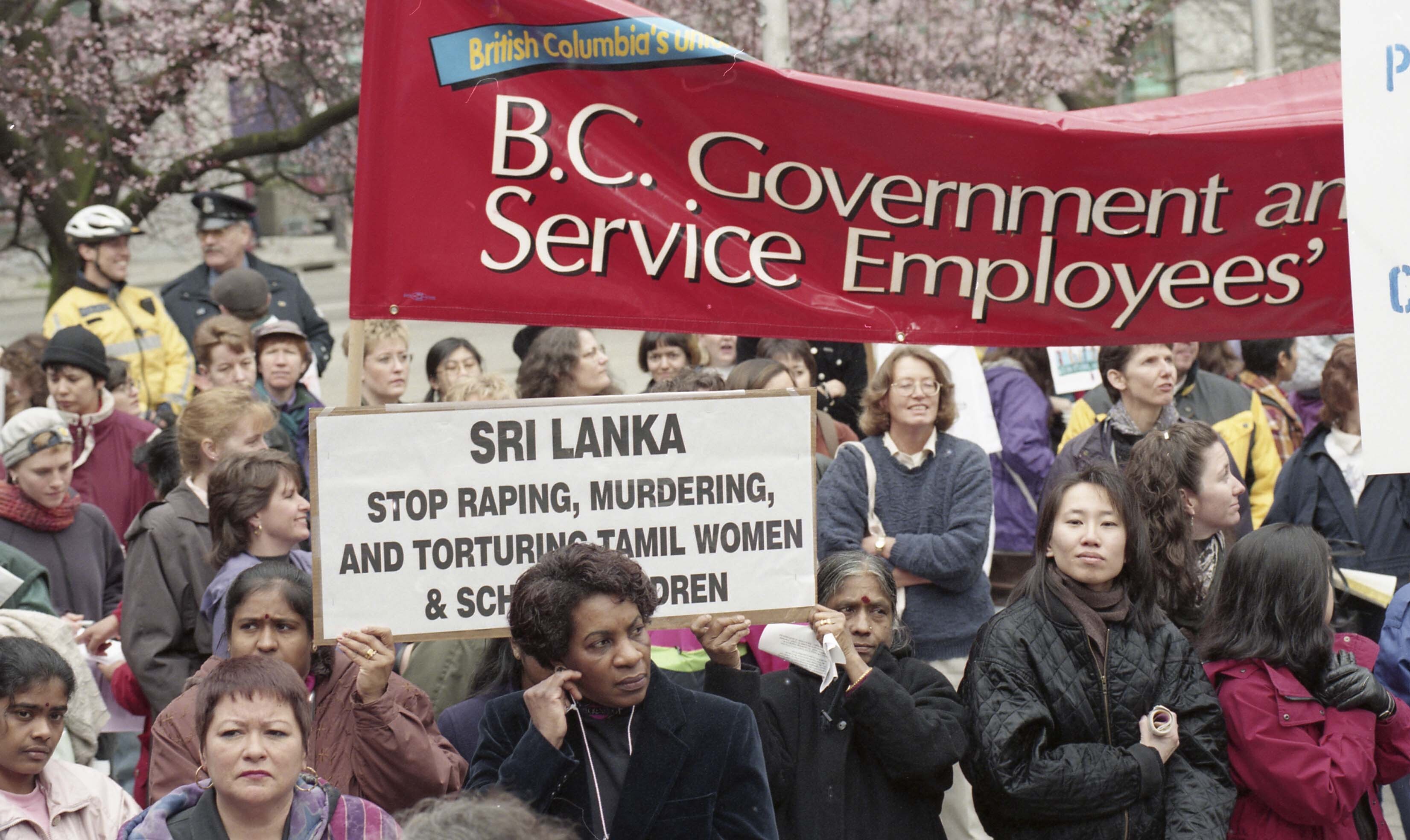 Photograph of a group of unidentified individuals, holding signs and banners, outside the Vancouver Art Gallery for a rally pertaining to International Women's Day. The event took place in Vancouver, British Columbia (B.C.).