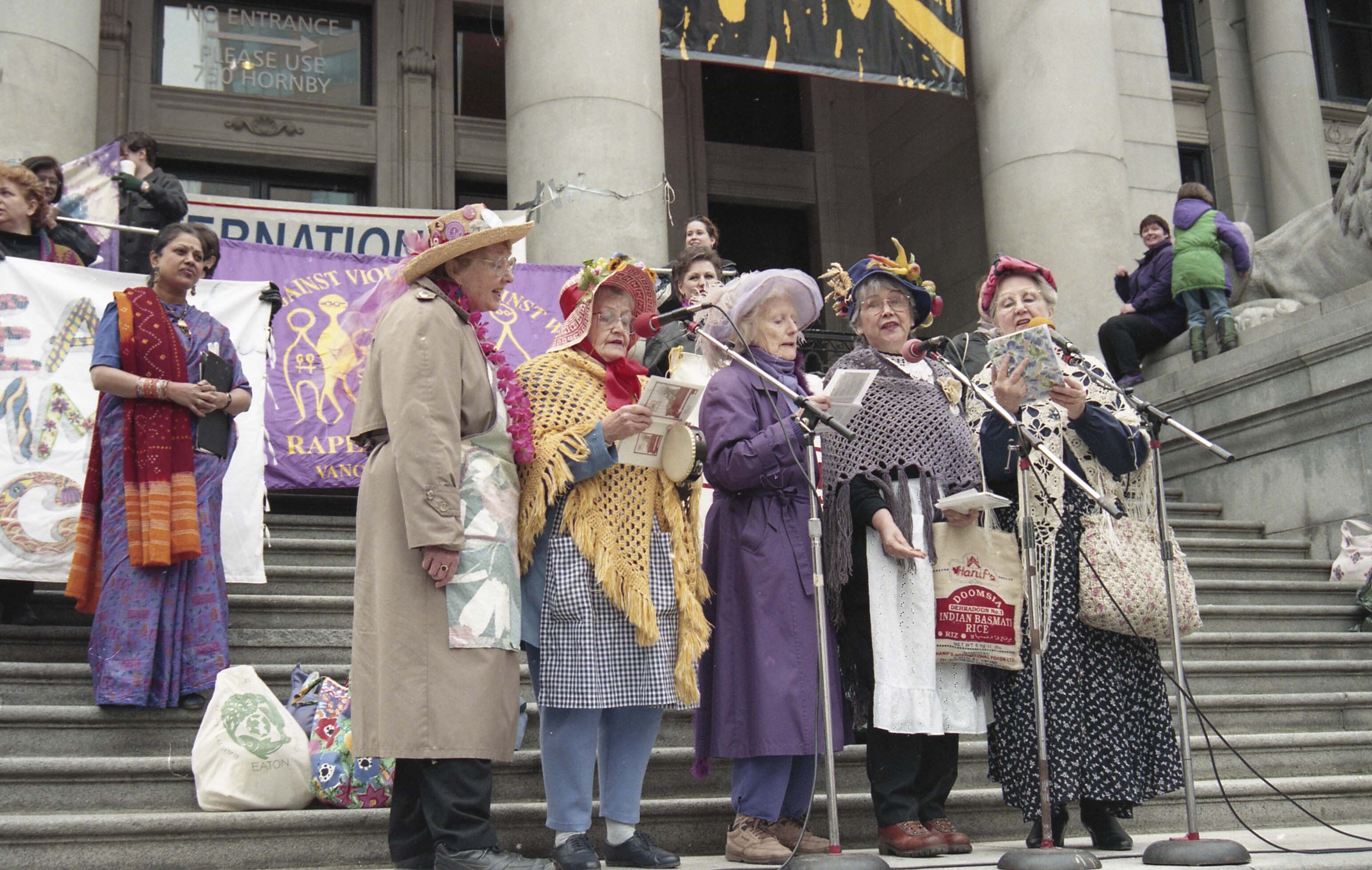 [Photograph of a group of speakers outside the Vancouver Art Gallery for International Women's Day]