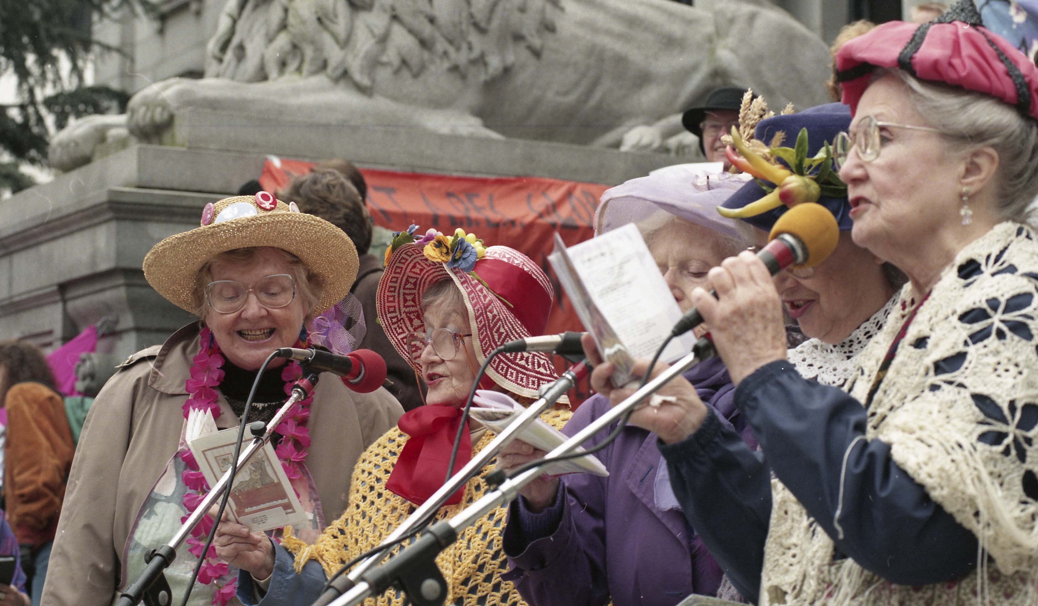 Photograph of a group of unidentified speakers outside the Vancouver Art Gallery for a rally pertaining to International Women's Day. The event took place in Vancouver, British Columbia (B.C.).