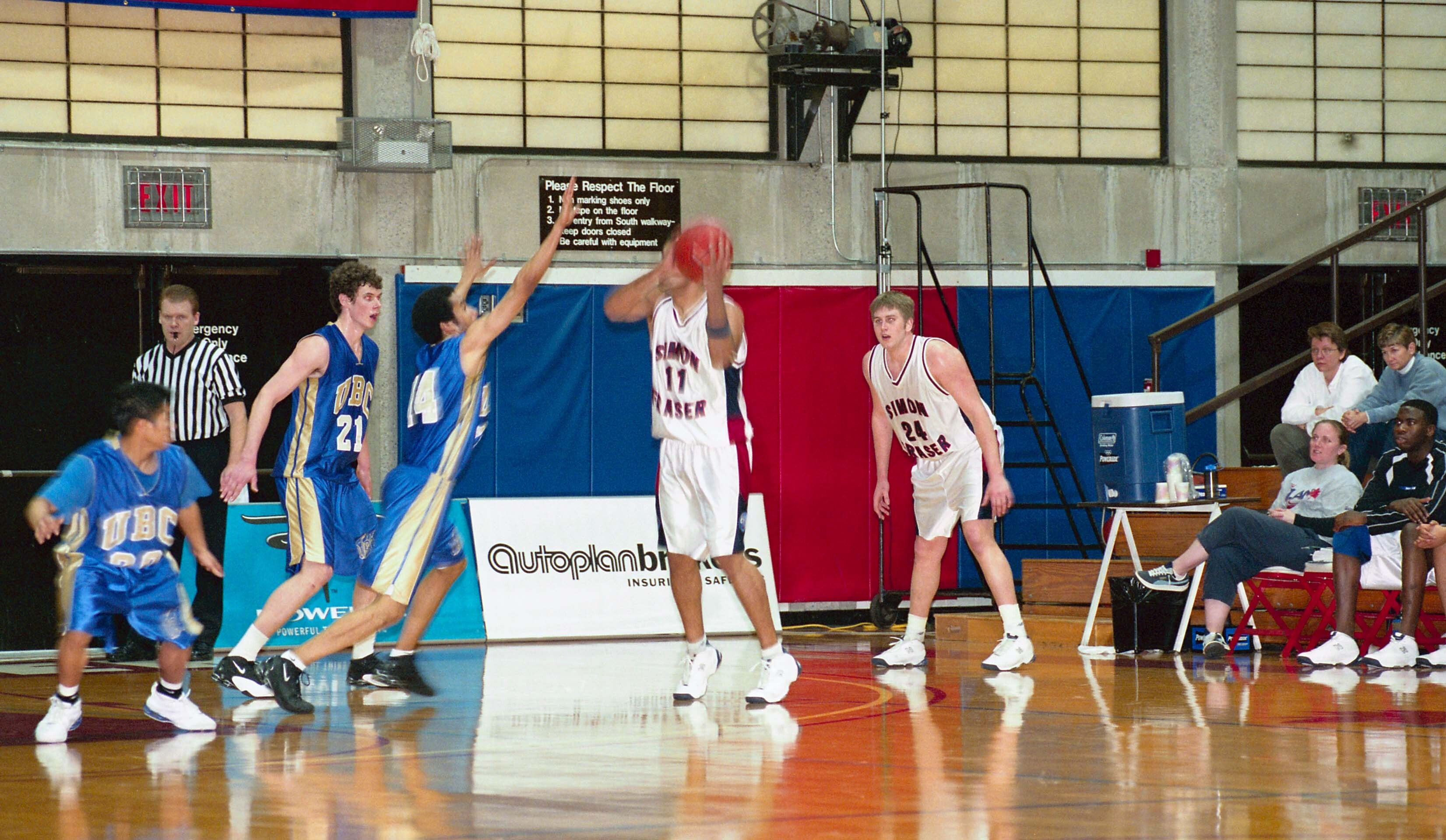 Photograph of Pasha Bains playing basketball for Simon Fraser University during an intercollegiate match against the University of British Columbia.