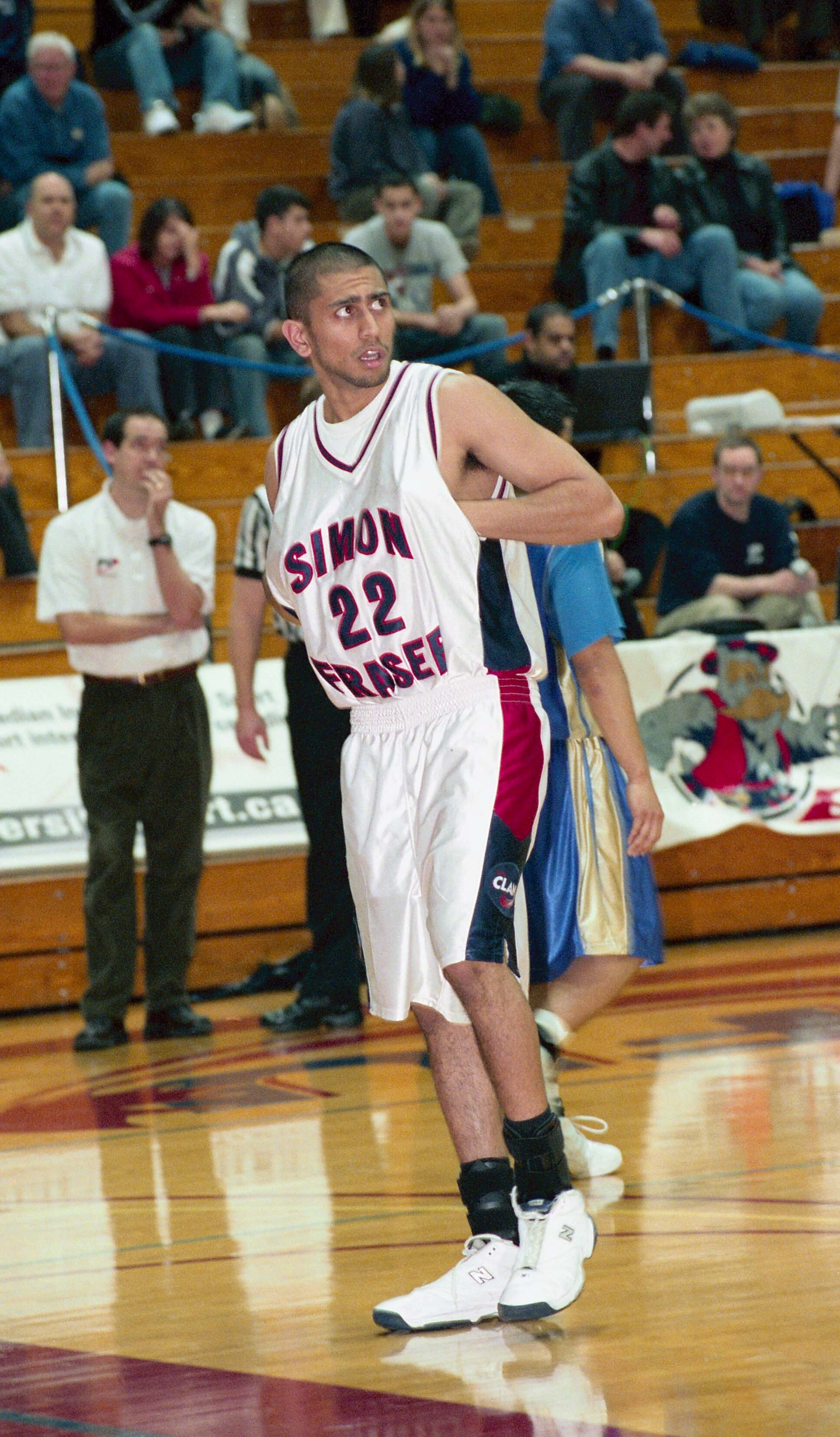 [Photograph of an individual playing basketball for Simon Fraser University during an intercollegiate match]