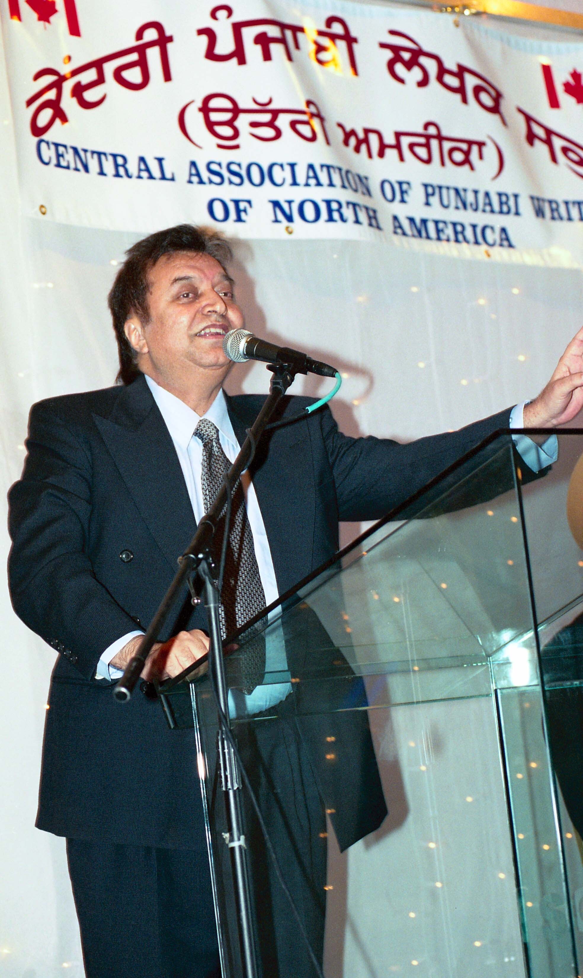 [Photograph of a speaker addressing the audience at an event hosted by the Central Association of Punjabi Writers in North America]