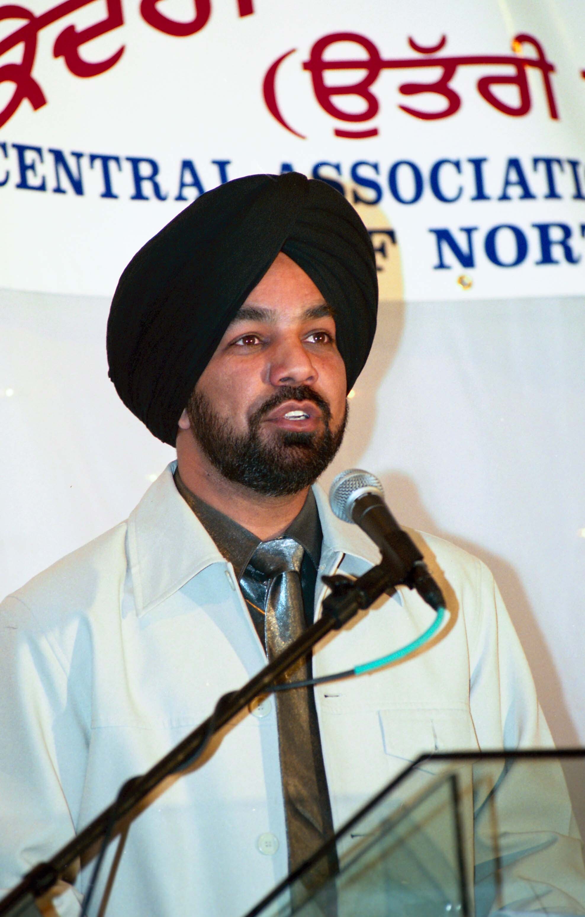 [Photograph of a speaker addressing the audience at an event hosted by the Central Association of Punjabi Writers in North America]