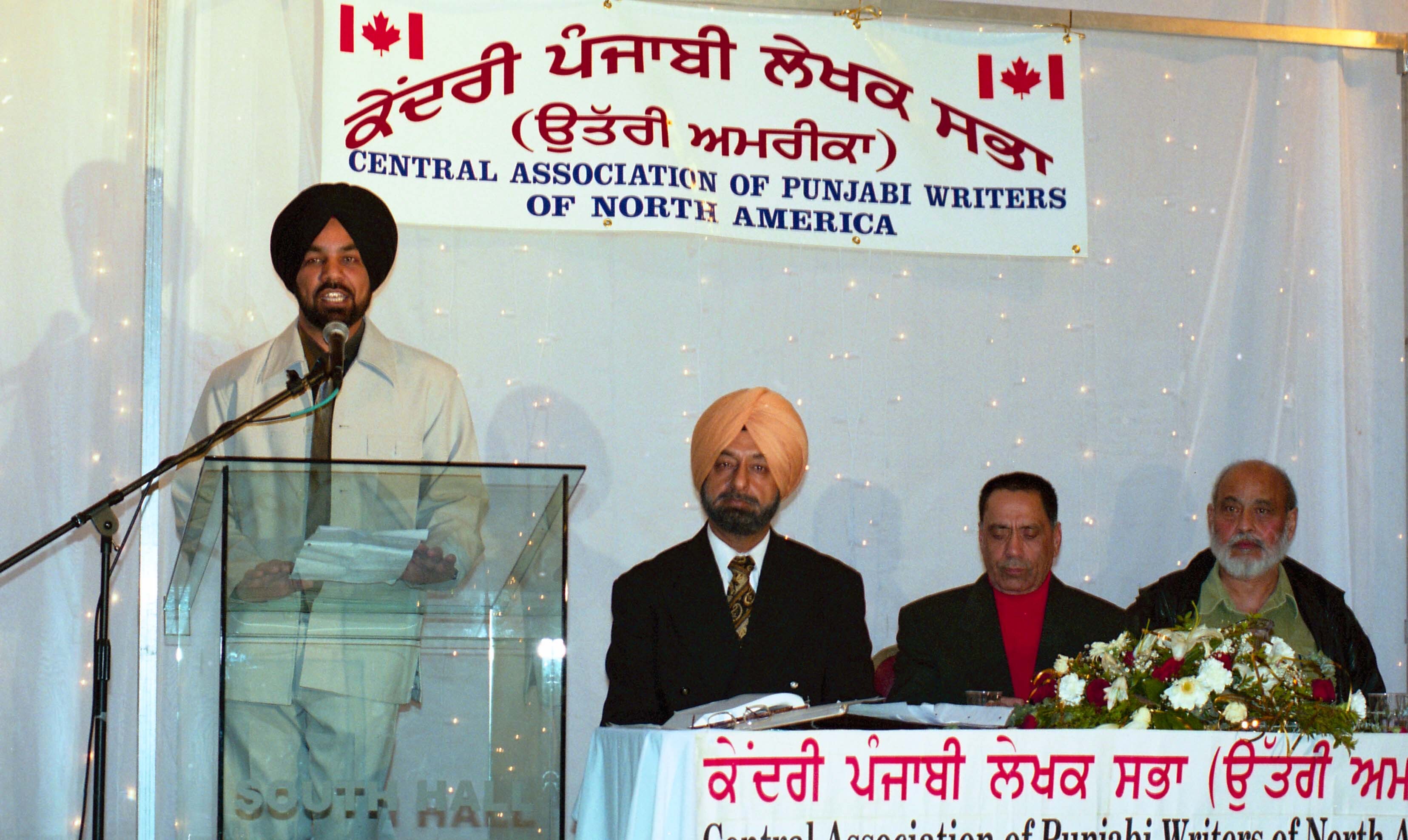 [Photograph of a speaker addressing the audience at an event hosted by the Central Association of Punjabi Writers in North America]