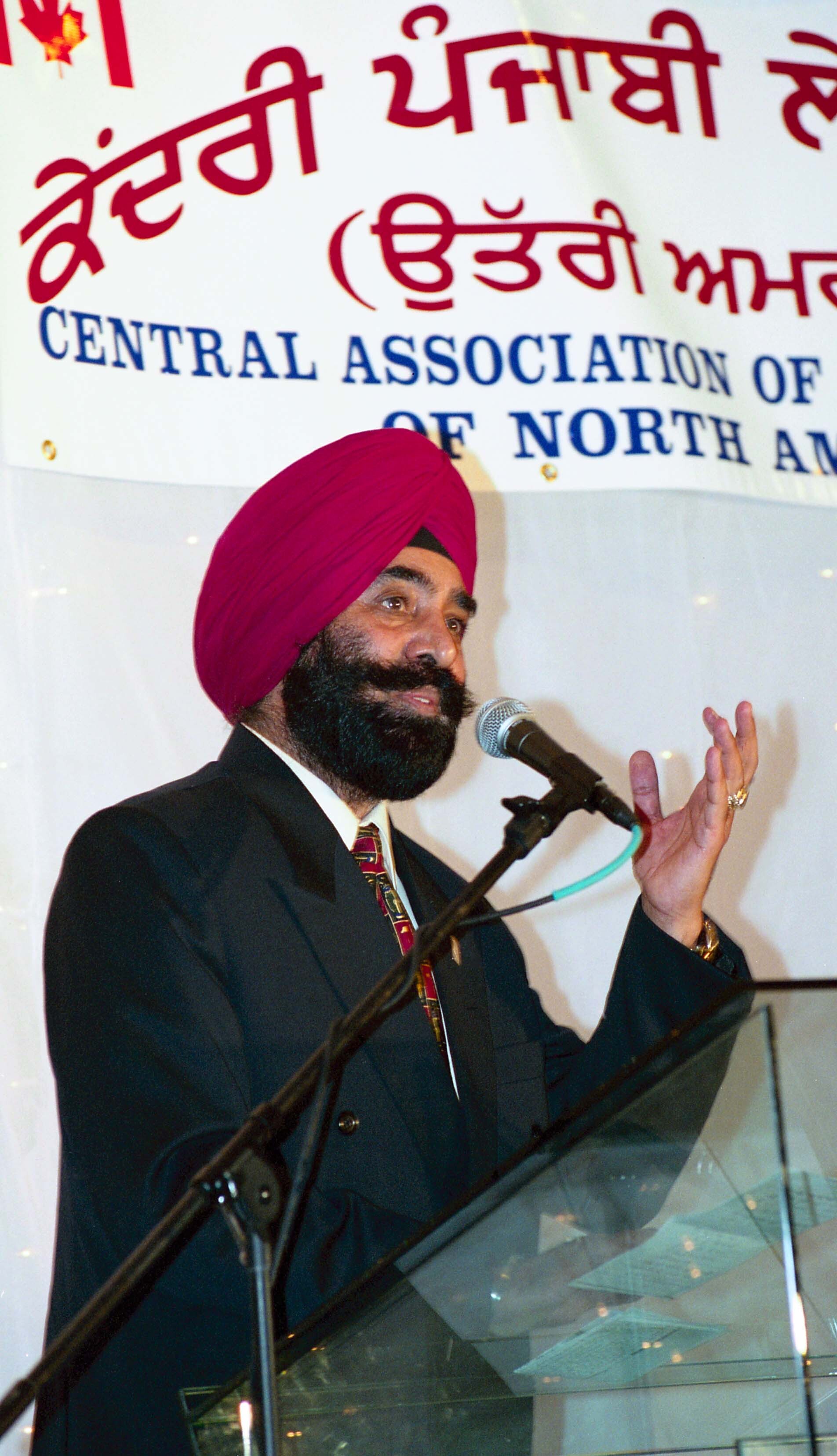 [Photograph of a speaker addressing the audience at an event hosted by the Central Association of Punjabi Writers in North America]