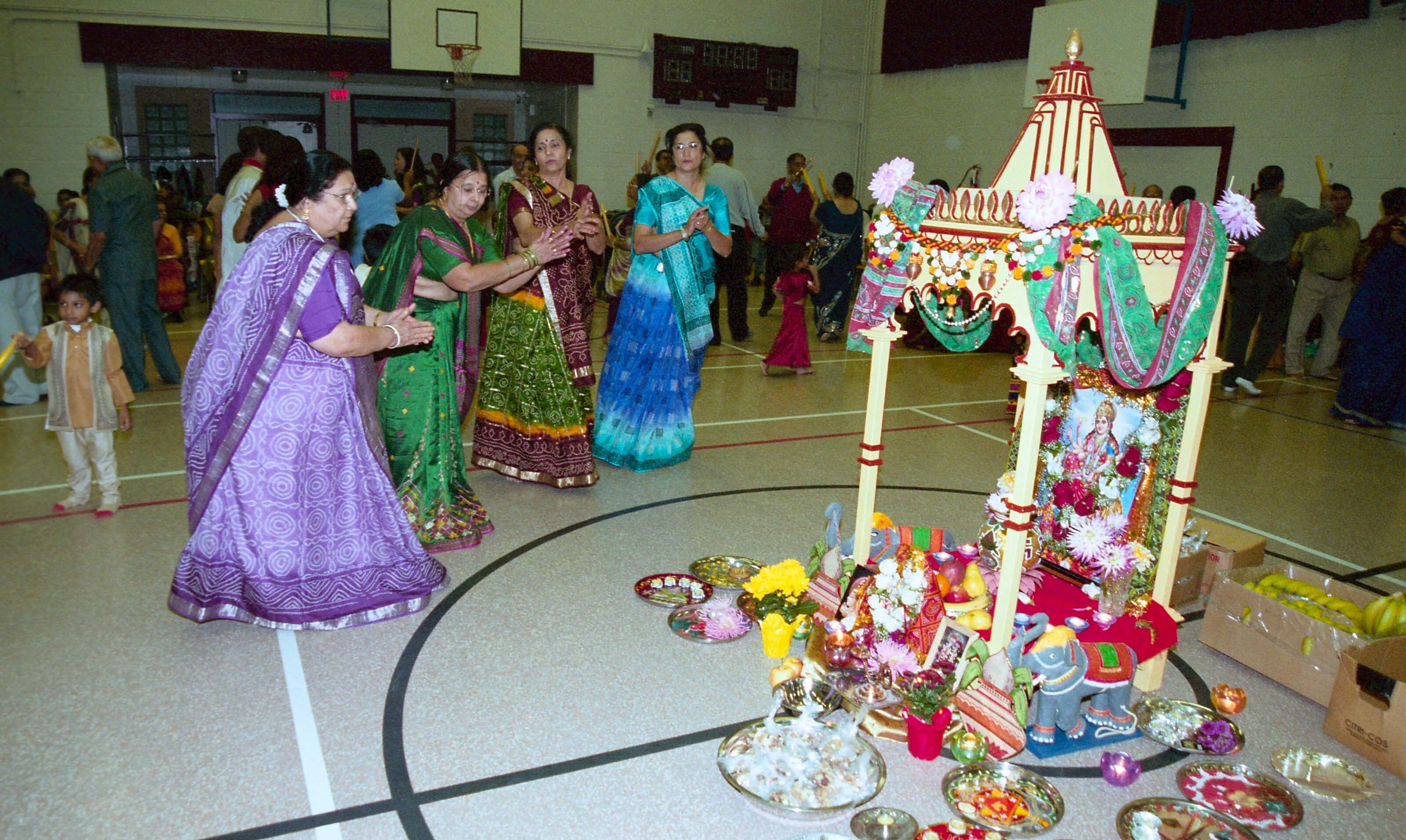 Photograph of a group of unidentified individuals performing garba, a folk dance, at the Navratri celebration organized by the Gujarati Hindu Seniors Society of British Columbia (GHSS) in Burnaby, British Columbia (B.C.).
