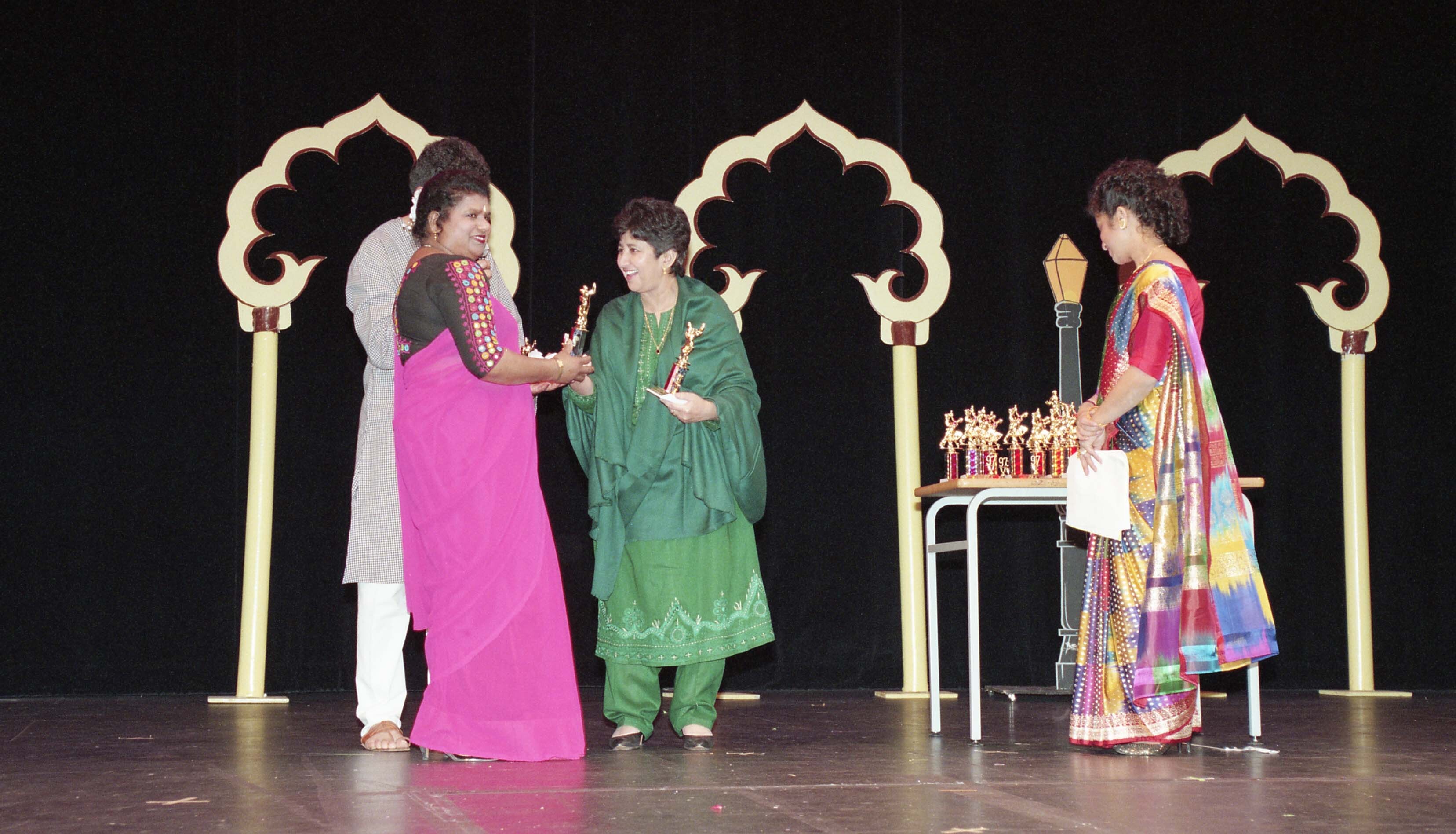 Photograph of Shushma Datt presenting awards to unidentified individuals at the Holi celebration organised at Burnaby South Secondary School, in Burnaby, British Columbia (B.C.).