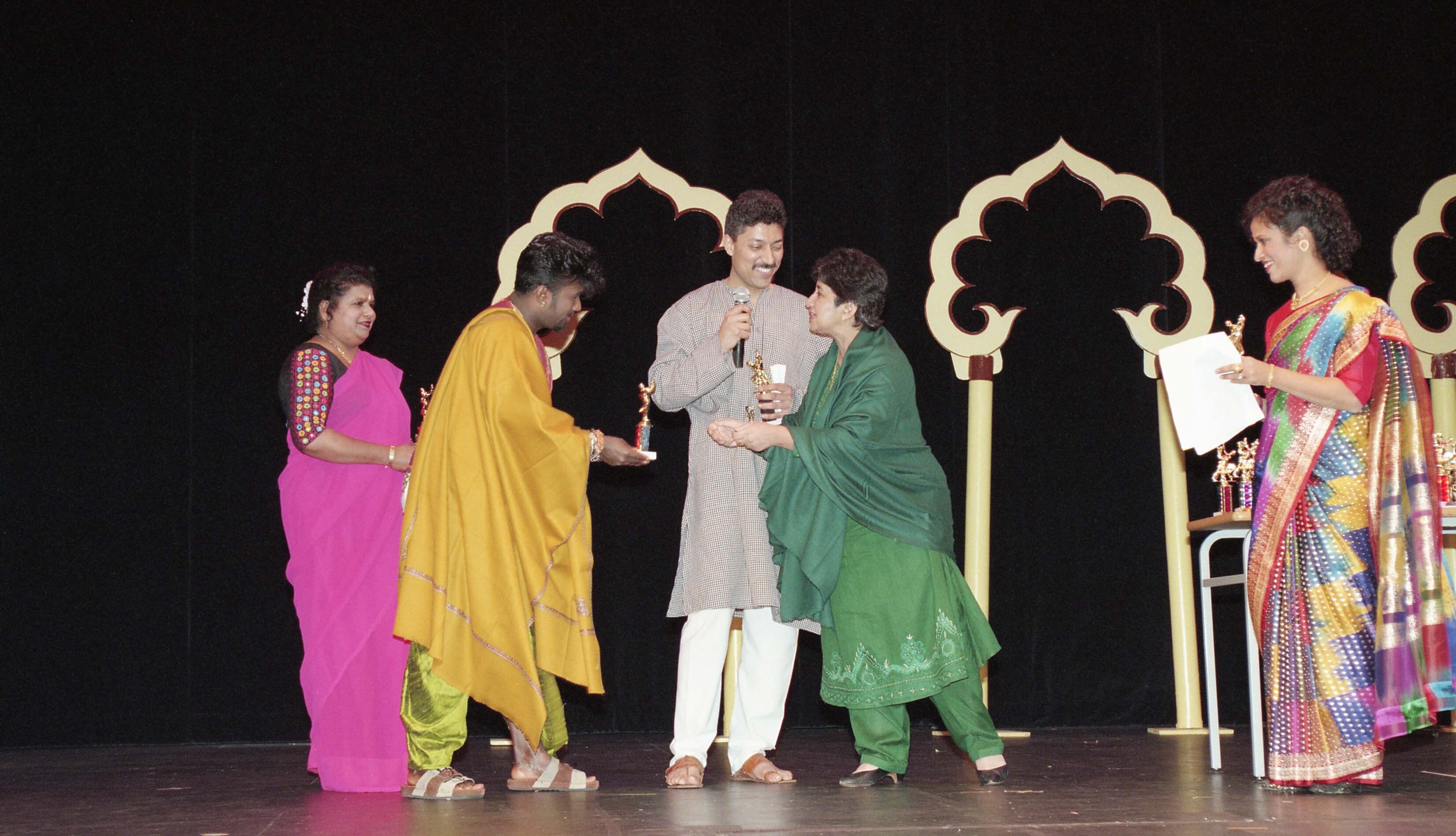 Photograph of Shushma Datt presenting awards to unidentified individuals at the Holi celebration organised at Burnaby South Secondary School, in Burnaby, British Columbia (B.C.). Kamal Sharma can be seen standing next to Datt, holding a microphone.