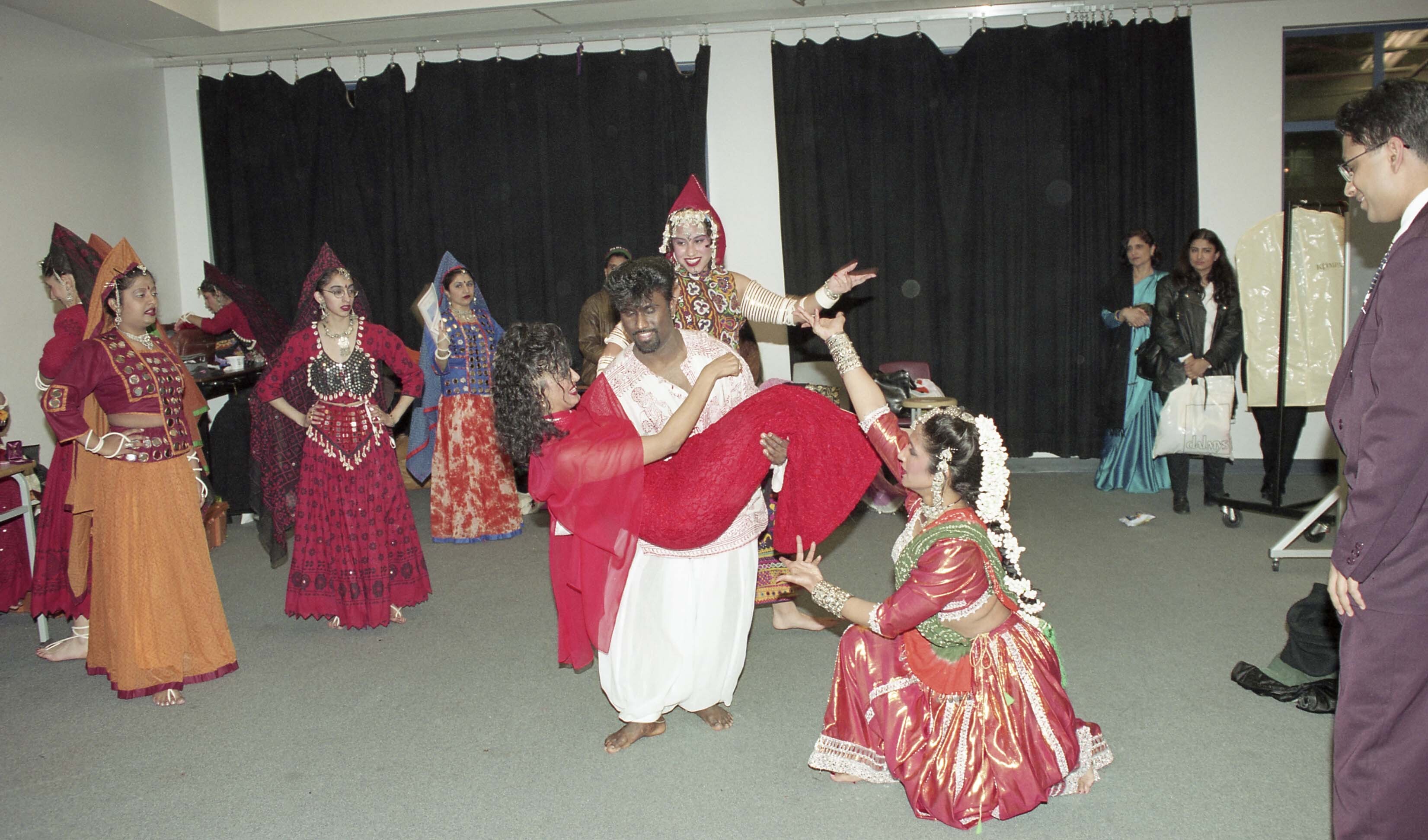Photograph of unidentified individuals backstage[?] at the Holi celebration organised at Burnaby South Secondary School, in Burnaby, British Columbia (B.C.).