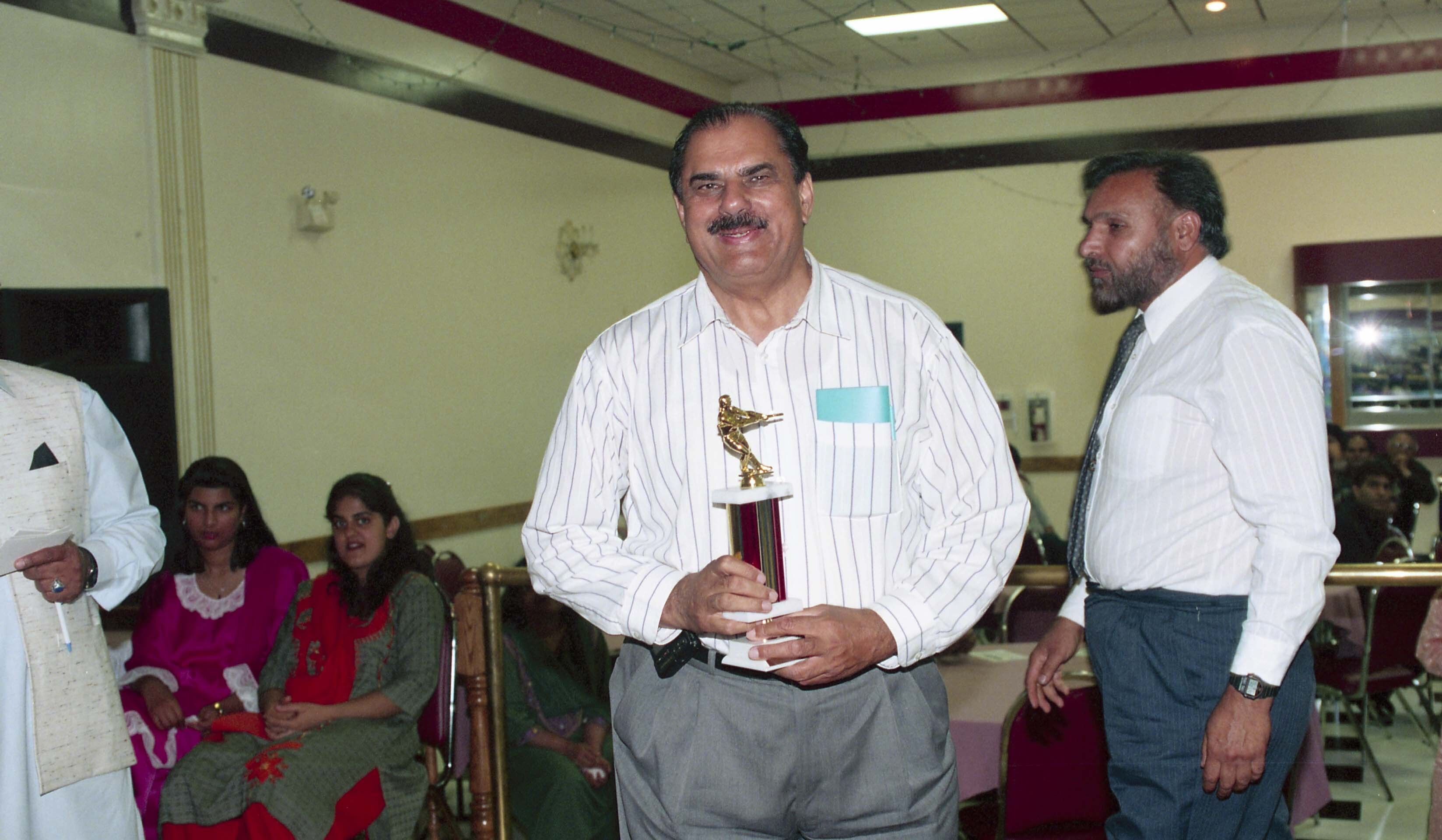 Photograph of a Riasat Ali Khan holding an award at a community event.