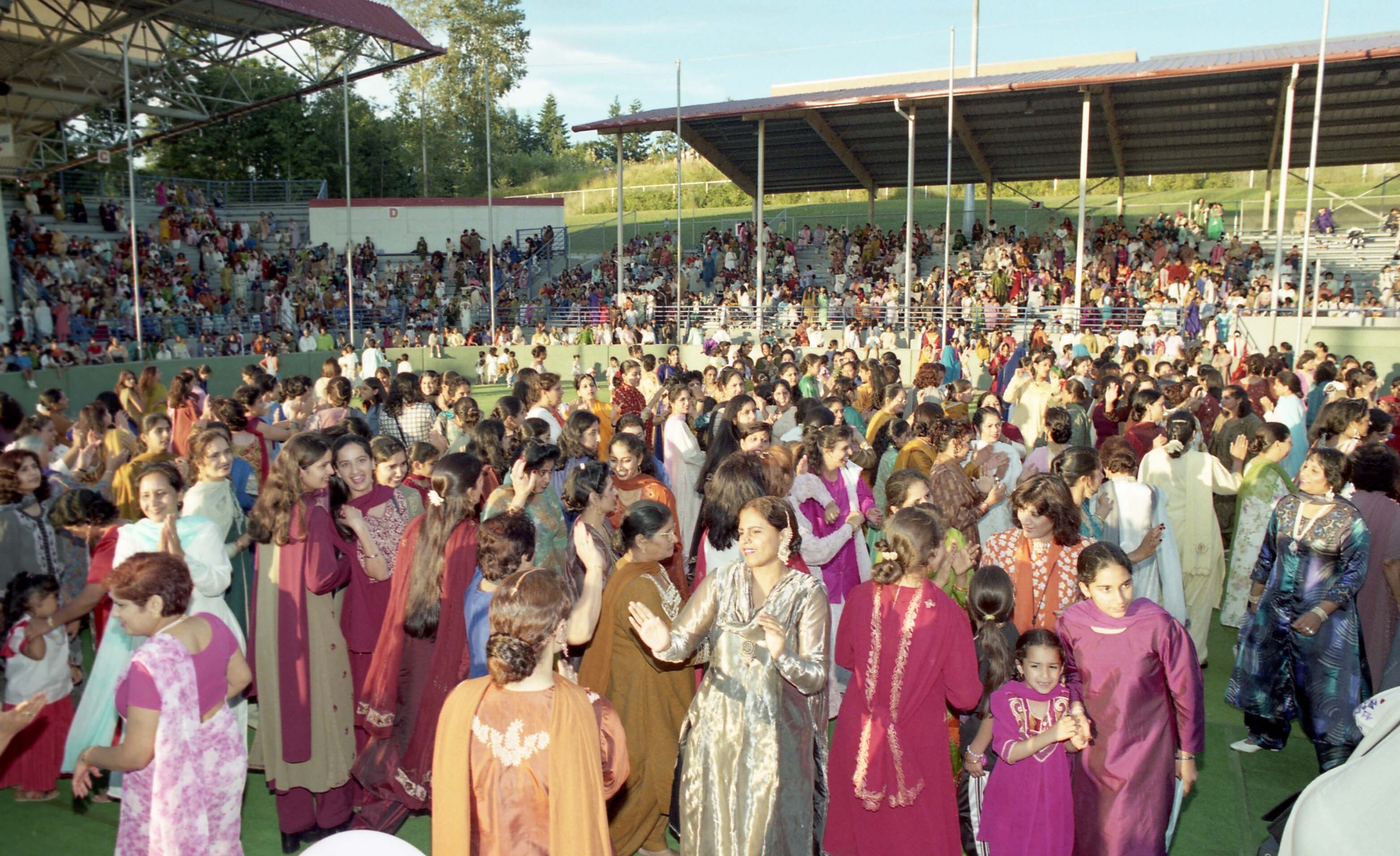 Photograph of a crowd of unidentified individuals dancing at a Teeyan (Teej) festival celebration hosted by the India Mahila Association[?] on August 2, 1998[?]. The event was held in Cloverdale, in Surrey, British Columbia (B.C.).