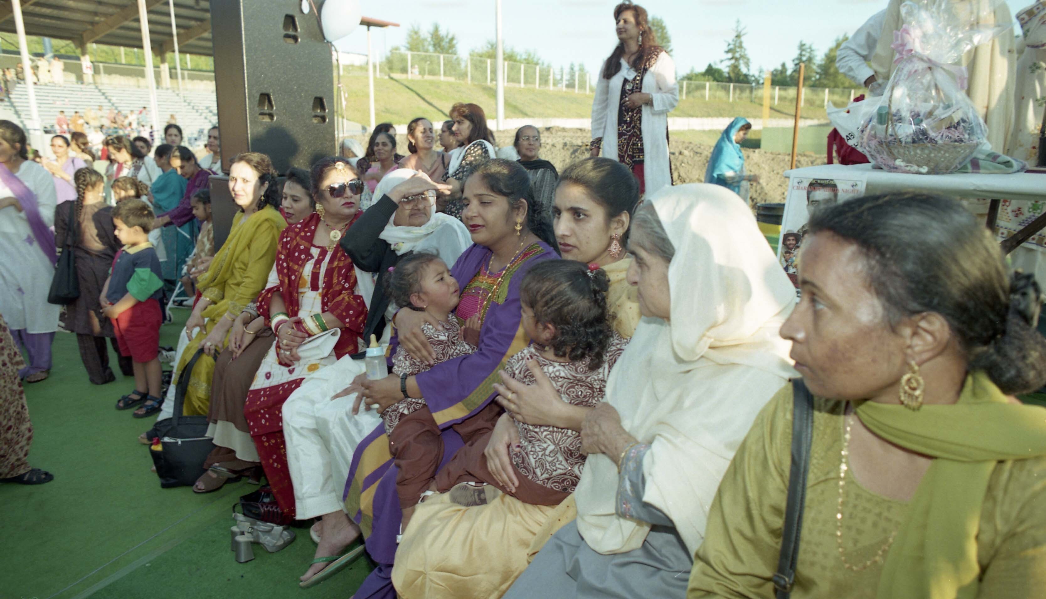 Photograph of a group of unidentified individuals sitting at a Teeyan (Teej) festival celebration hosted by the India Mahila Association[?] on August 2, 1998[?]. The event was held in Cloverdale, in Surrey, British Columbia (B.C.).