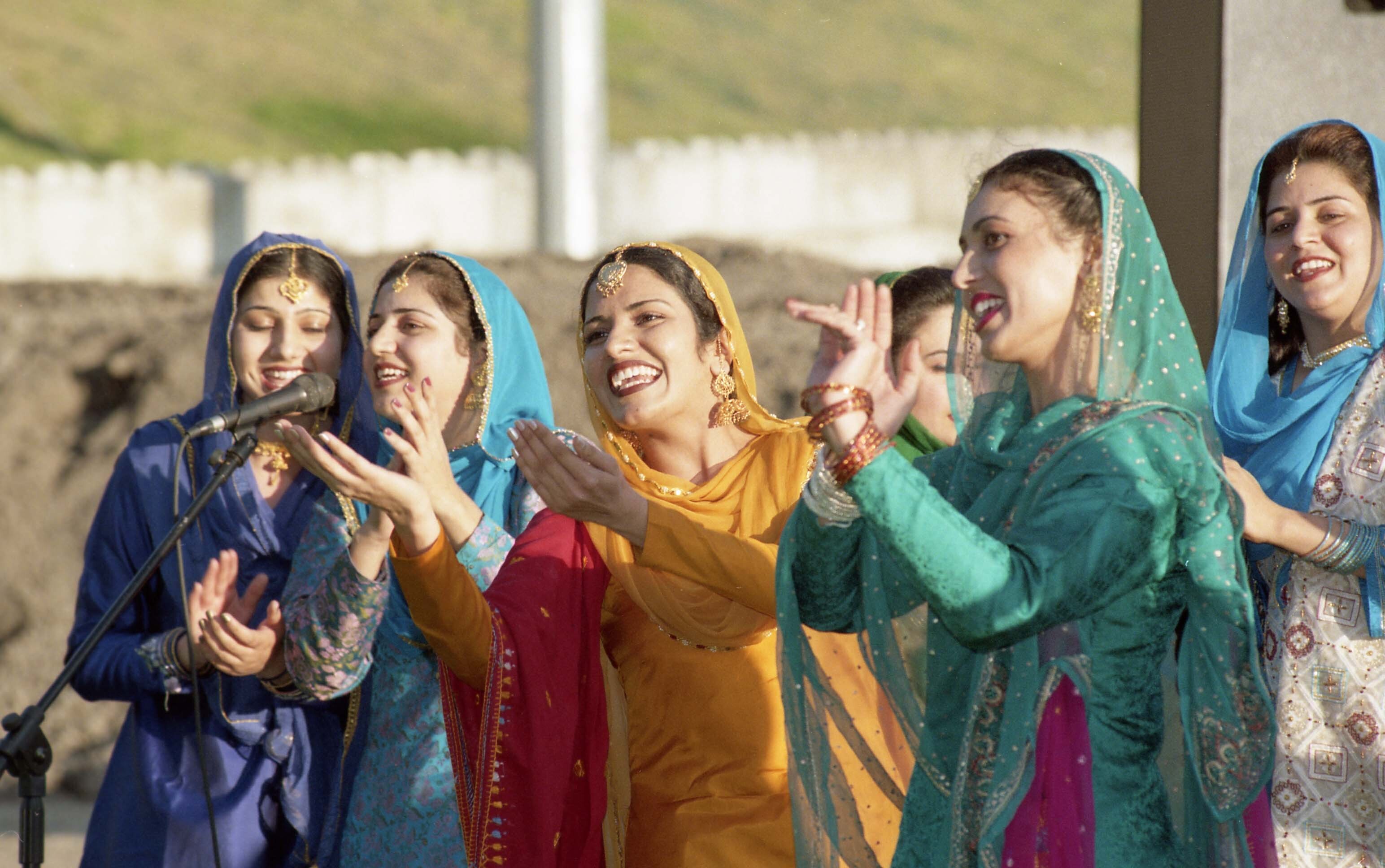 Photograph of a group of unidentified individuals performing folk songs onstage at a Teeyan (Teej) festival celebration hosted by the India Mahila Association[?] on August 2, 1998[?]. The event was held in Cloverdale, in Surrey, British Columbia (B.C.).
