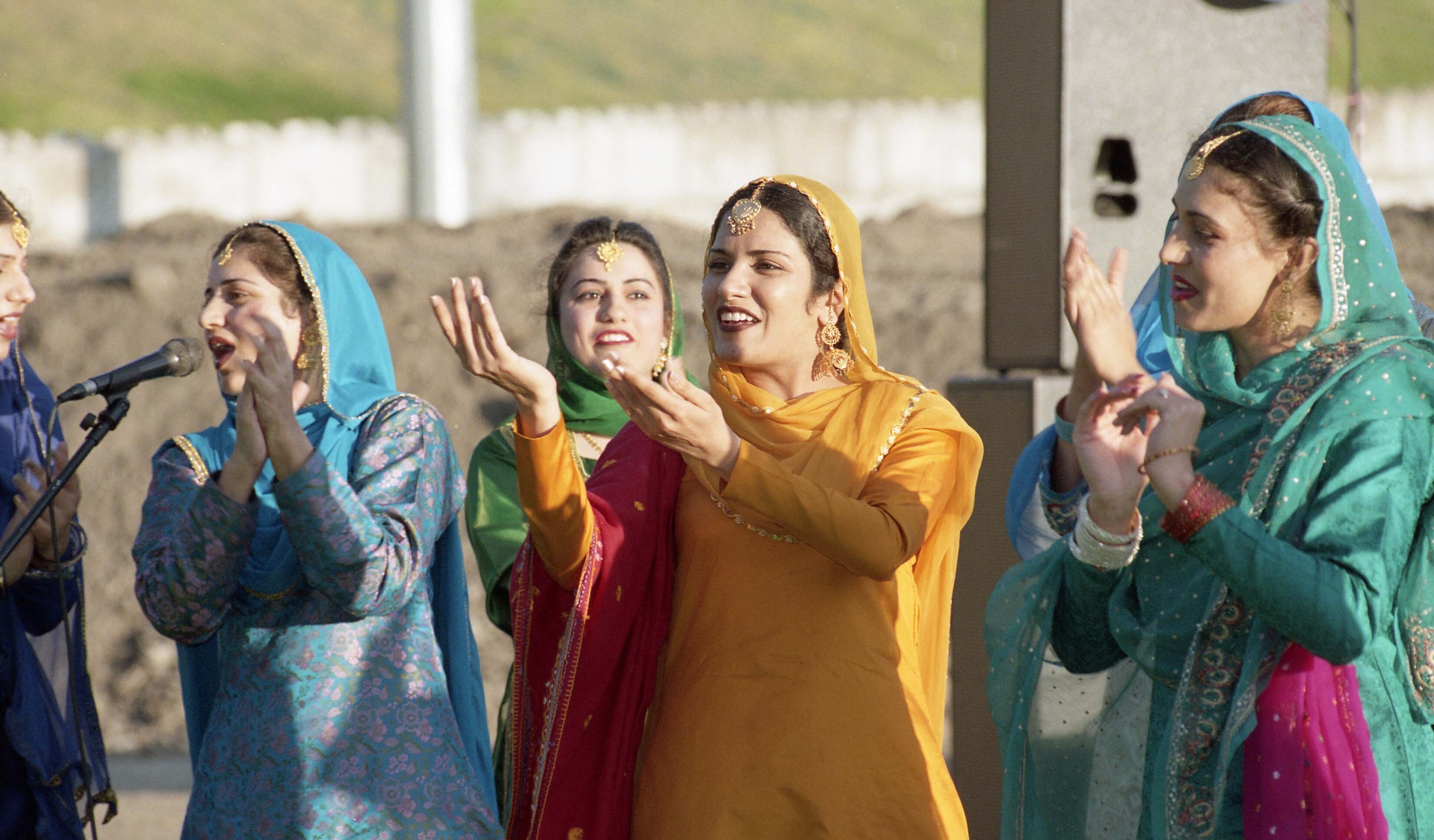 Photograph of a group of unidentified individuals performing folk songs onstage at a Teeyan (Teej) festival celebration hosted by the India Mahila Association[?] on August 2, 1998[?]. The event was held in Cloverdale, in Surrey, British Columbia (B.C.).