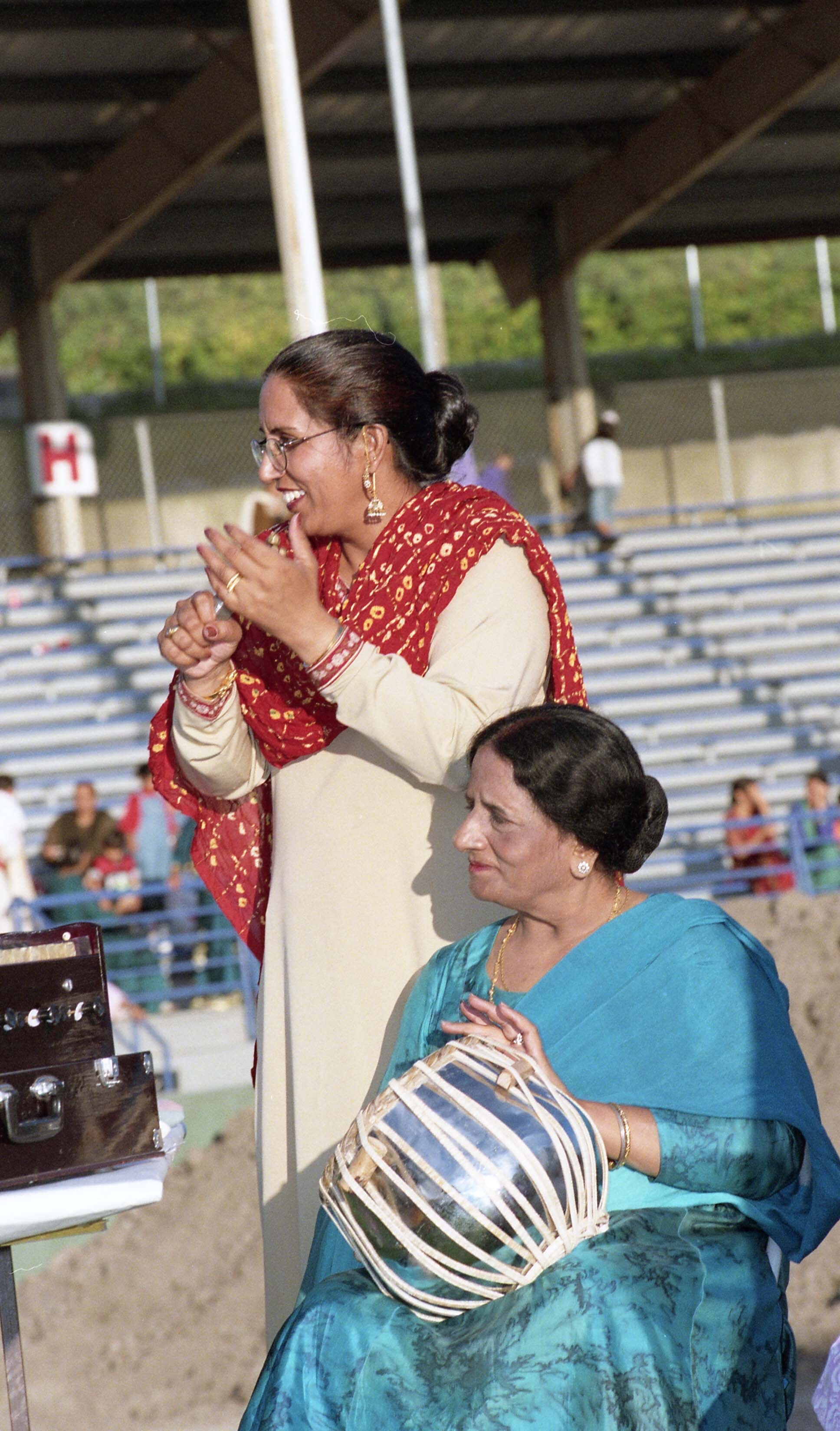 Photograph of Surinder Kaur and an unidentified individual playing Panjabi folk musical instruments at a Teeyan (Teej) festival celebration hosted by the India Mahila Association[?] on August 2, 1998[?]. The event was held in Cloverdale, in Surrey, British Columbia (B.C.).