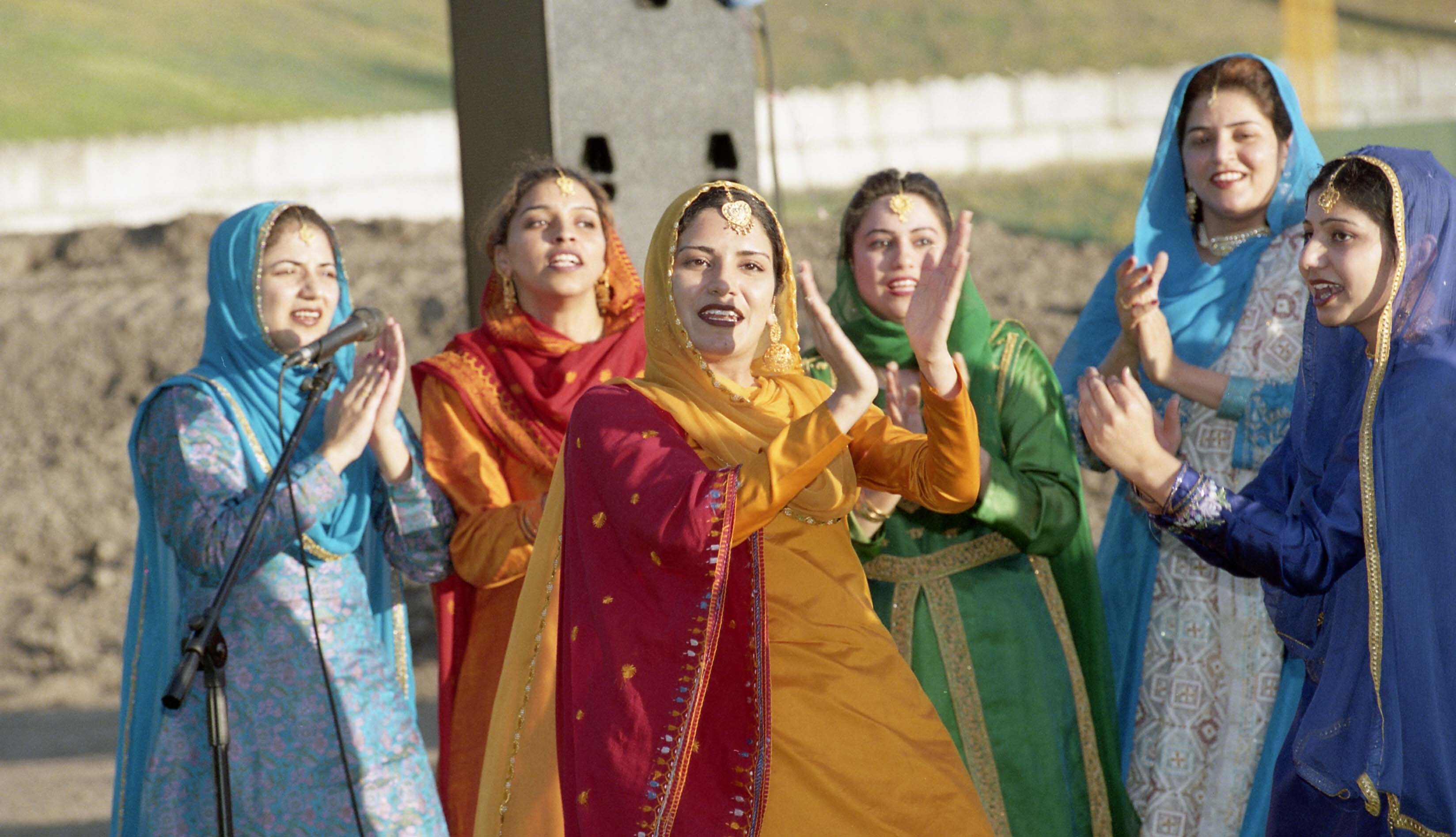 Photograph of a group of unidentified individuals performing folk songs and dancing during giddha[?] onstage at a Teeyan (Teej) festival celebration hosted by the India Mahila Association[?] on August 2, 1998[?]. The event was held in Cloverdale, in Surrey, British Columbia (B.C.).