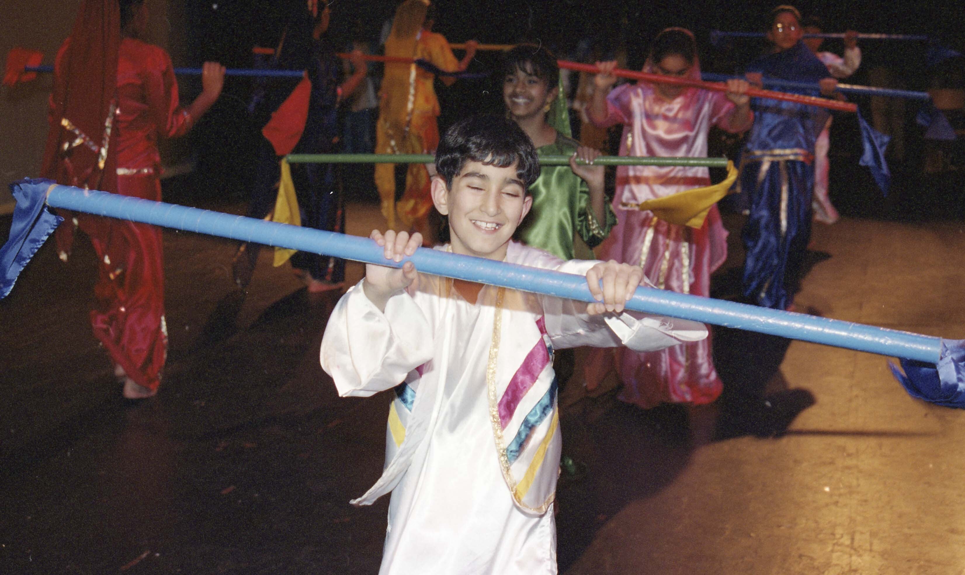 Photograph of a group of unidentified performers dancing at a Rangeela Dance School event held at Massey Theatre in New Westminster, British Columbia (B.C.).