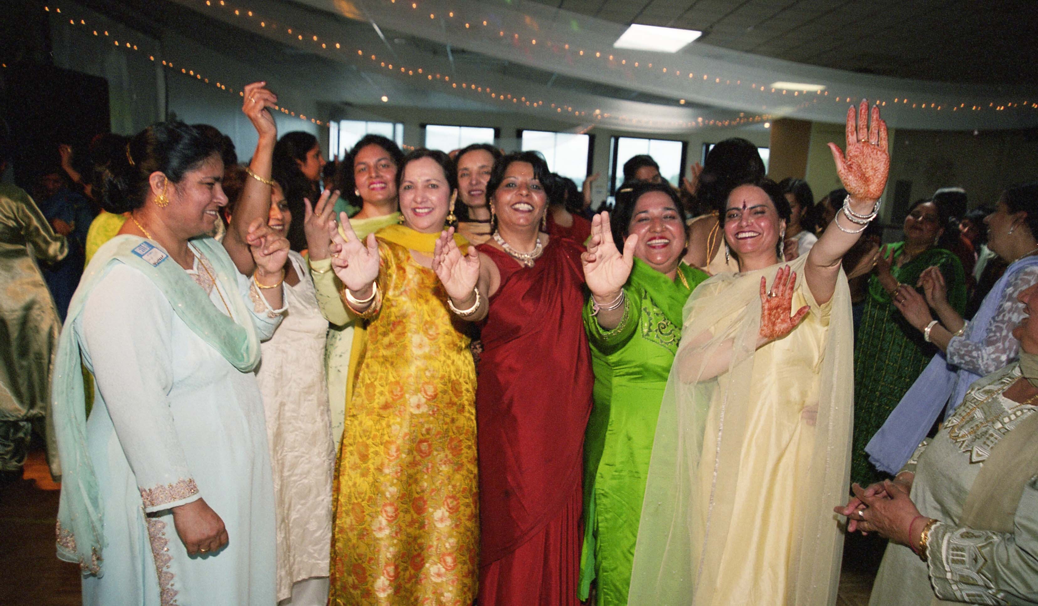 Photograph of a group of unidentified individuals, including Sandy Rakhra, dancing at a Teeyan celebration event at Fraserview Banquet Hall, in Vancouver, British Columbia (B.C.) on June 10, 2001.