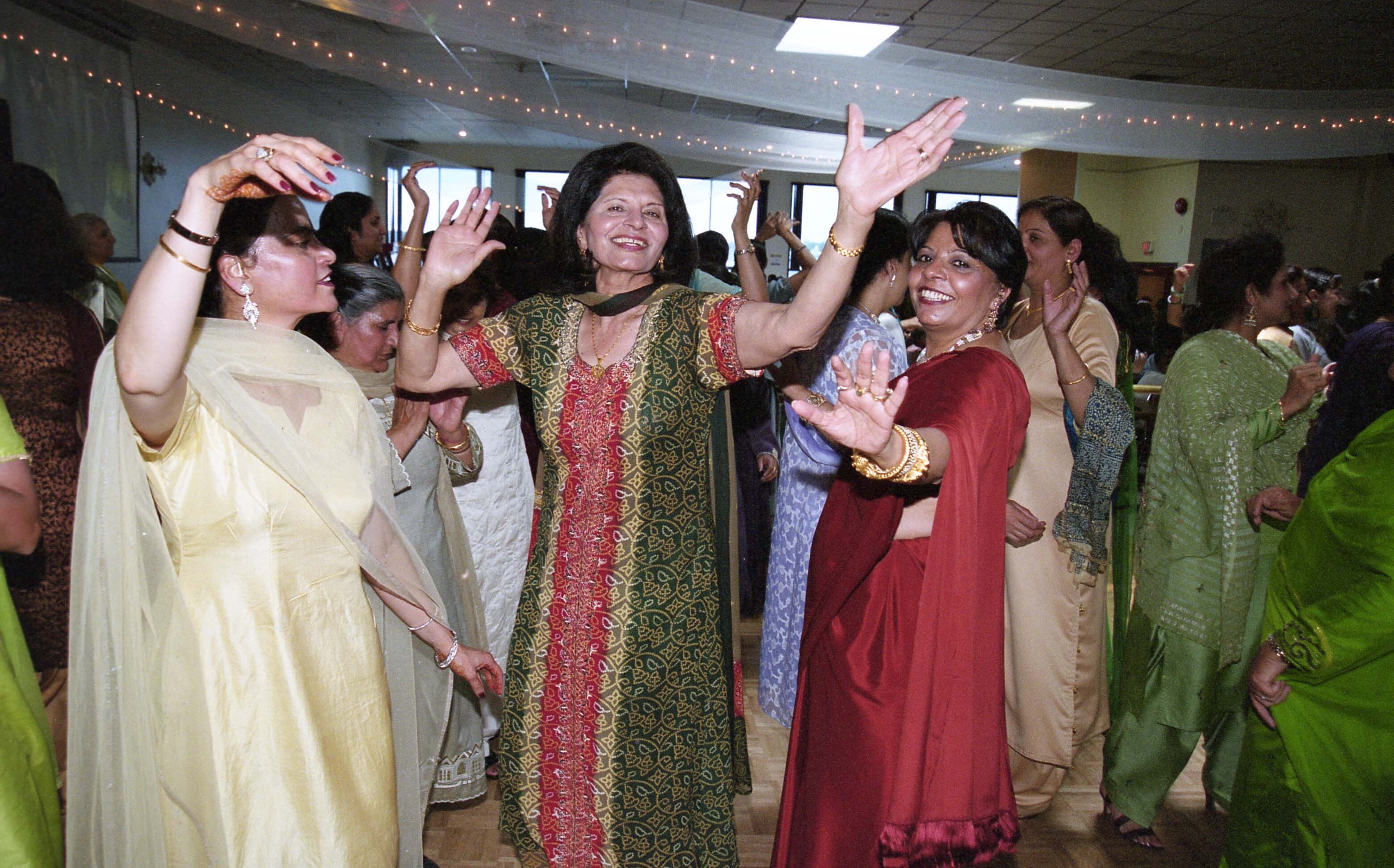 Photograph of a group of unidentified individuals, including Sandy Rakhra, dancing at a Teeyan celebration event at Fraserview Banquet Hall, in Vancouver, British Columbia (B.C.) on June 10, 2001.