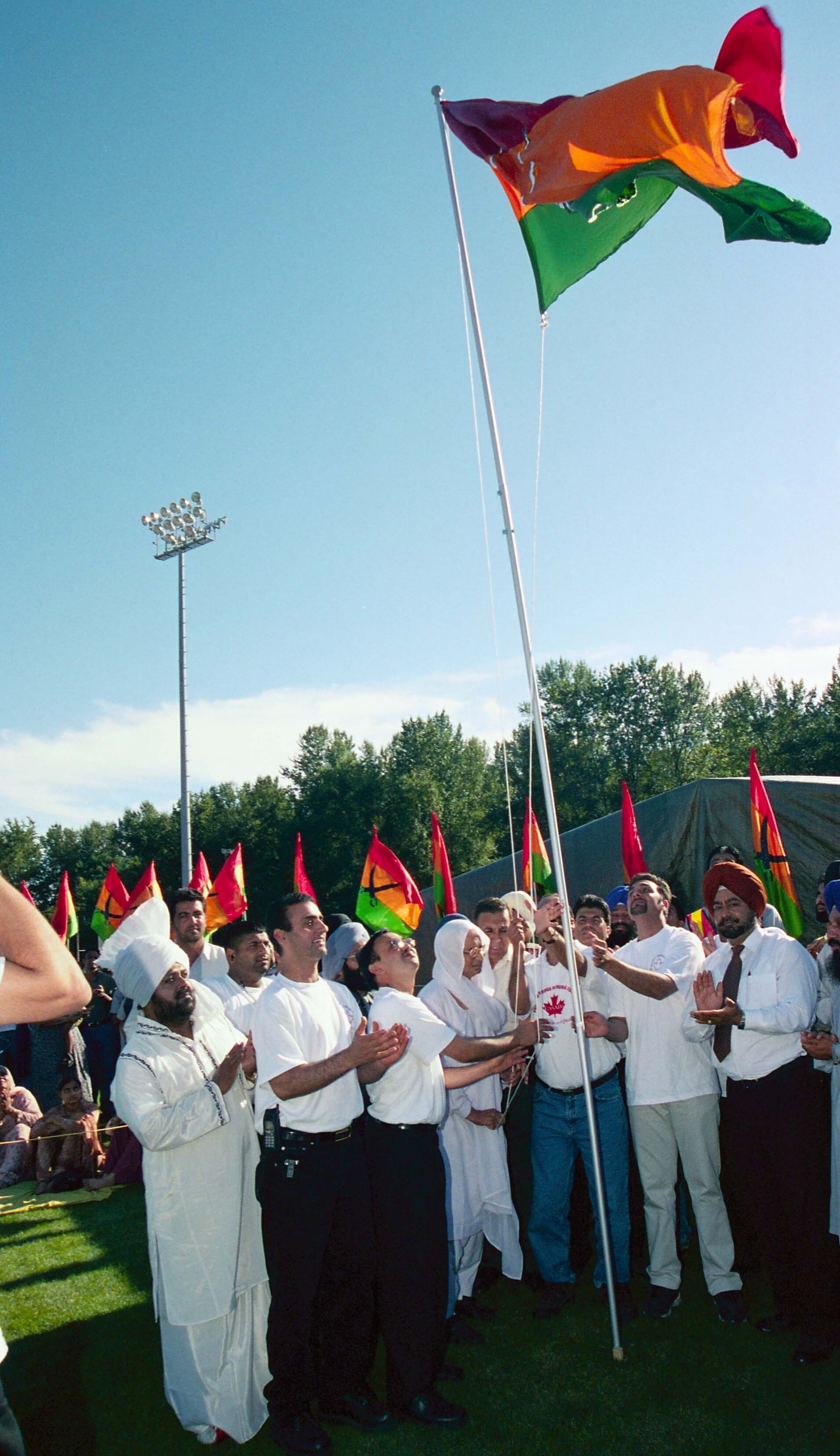 Photograph of a group of unidentified individuals hoisting a flag at the Ghadri Babe Mela organised by Professor Mohan Singh Memorial Foundation (Canada) in Bear Creek, Surrey, British Columbia (B.C.).