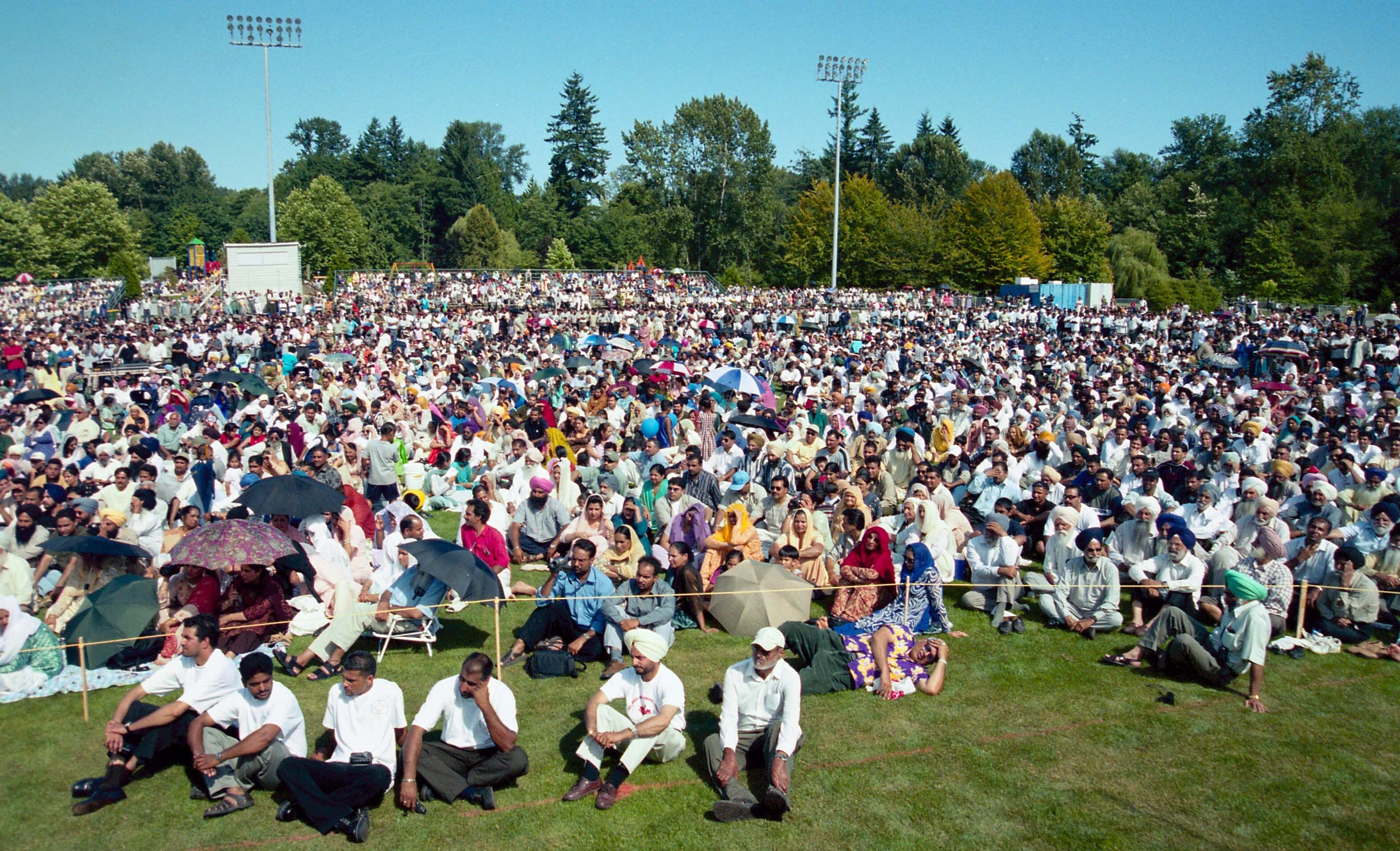 Photograph of a group of unidentified individuals at the Ghadri Babe Mela organised by Professor Mohan Singh Memorial Foundation (Canada) in Bear Creek, Surrey, British Columbia (B.C.).