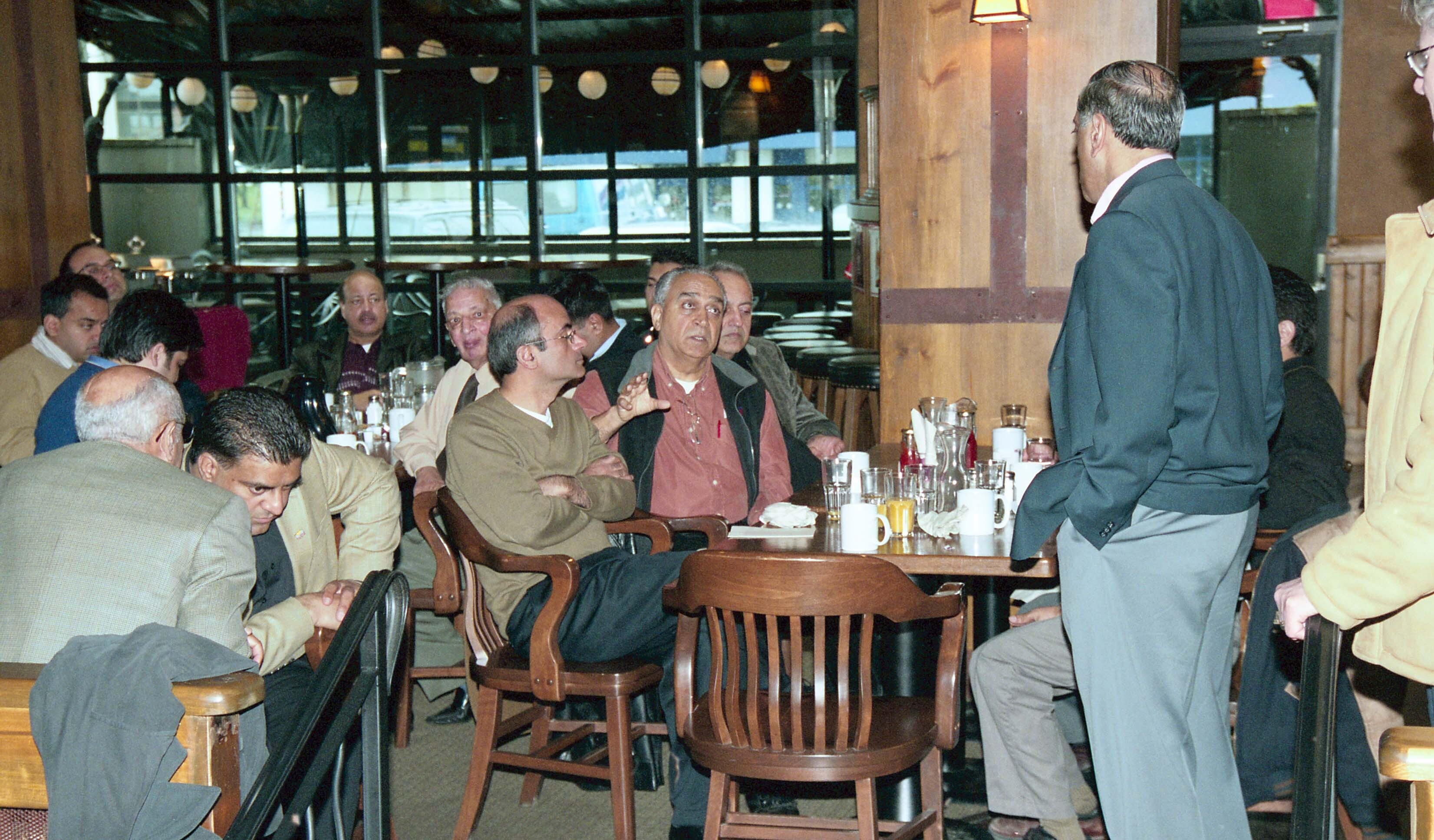 Photograph of Wallace Oppal conversing with an unidentified individual from the audience during a breakfast event at a restaurant.