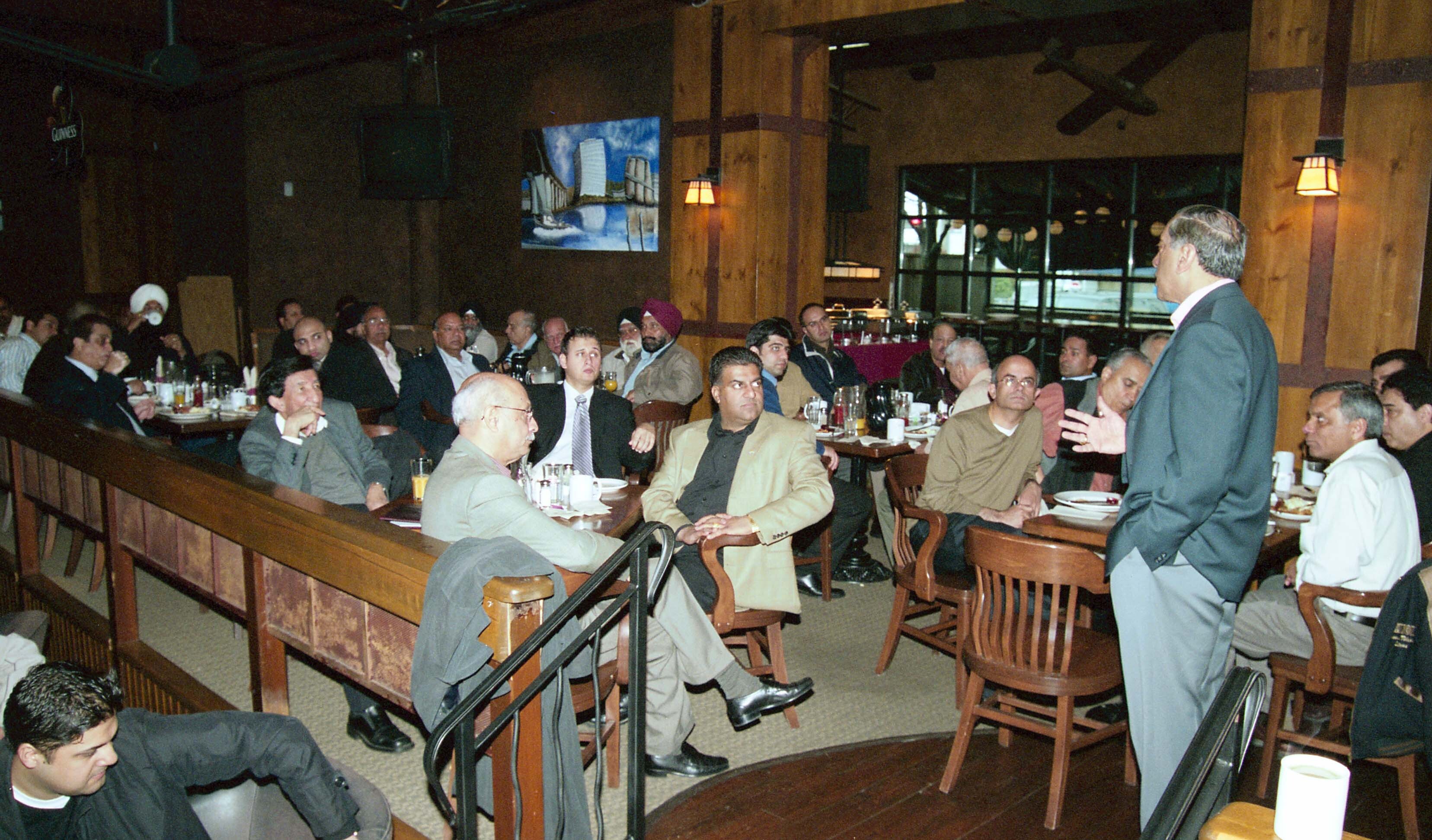 Photograph of Wallace Oppal addressing the audience during a breakfast event at a restaurant.