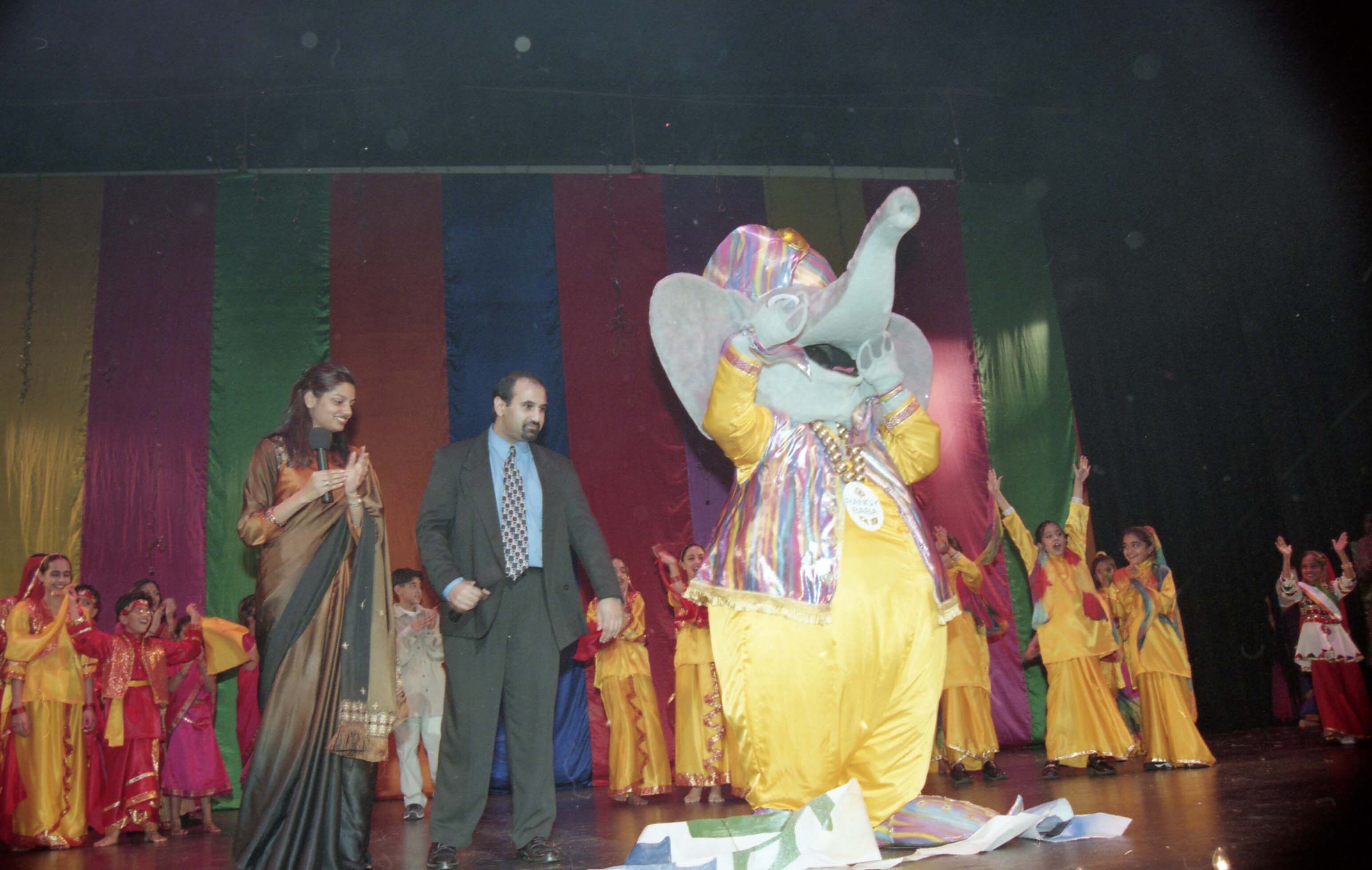 Photograph of the Rangeela Dance School mascot, an elephant by the name of Rangy Baba, onstage with a group of unidentified individuals, at Massey Theatre in New Westminster, British Columbia. Individuals, performers and mascot were gathered for a Rangeela Dance School event.