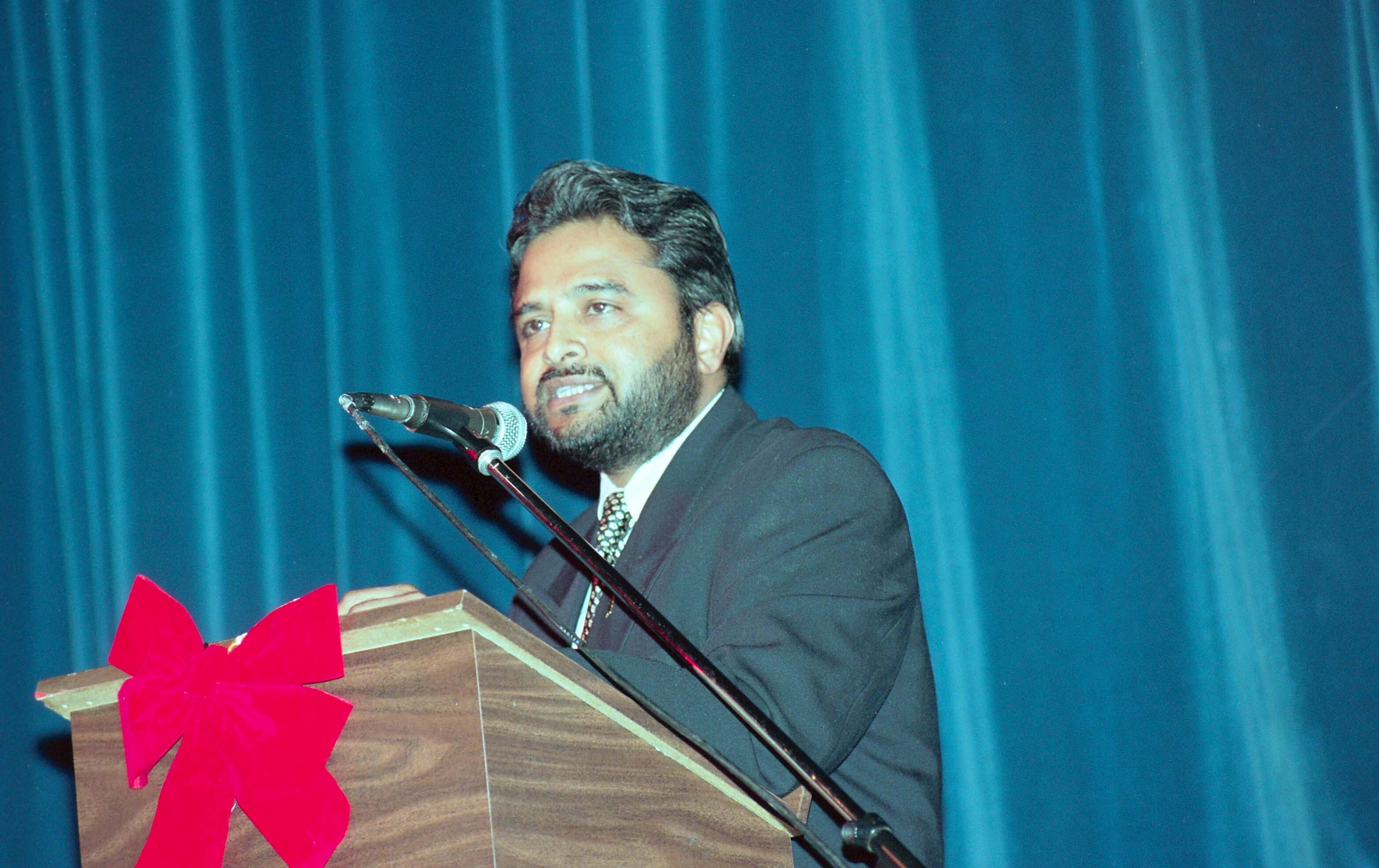 [Photograph of an unidentified individual addressing the audience at a language event]