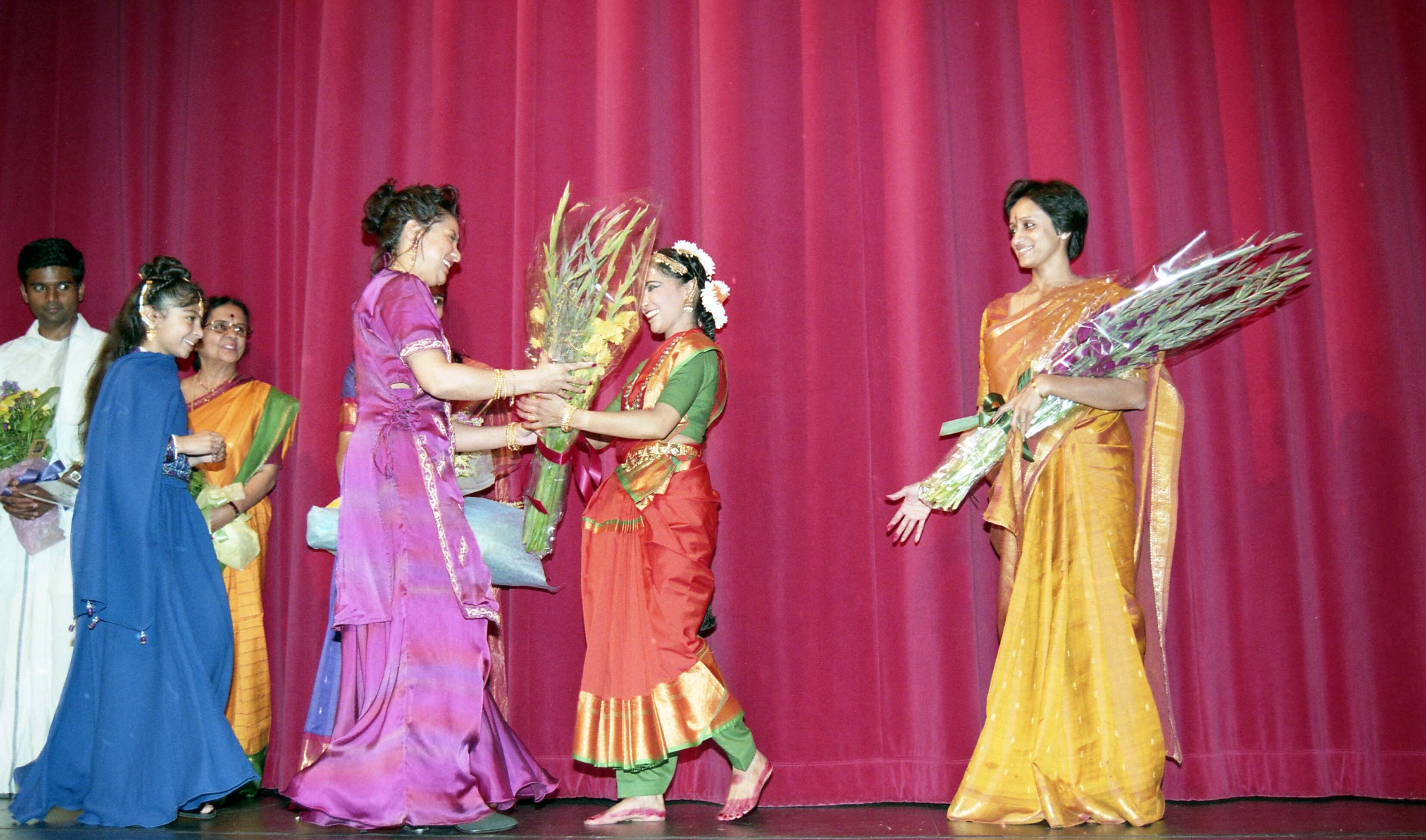 Photograph of a Bharatanatyam dancer receiving flowers onstage at Burnaby South Secondary School in British Columbia. The unidentified individuals had gathered for a dance recital presented by Sulochana Dance Academy.