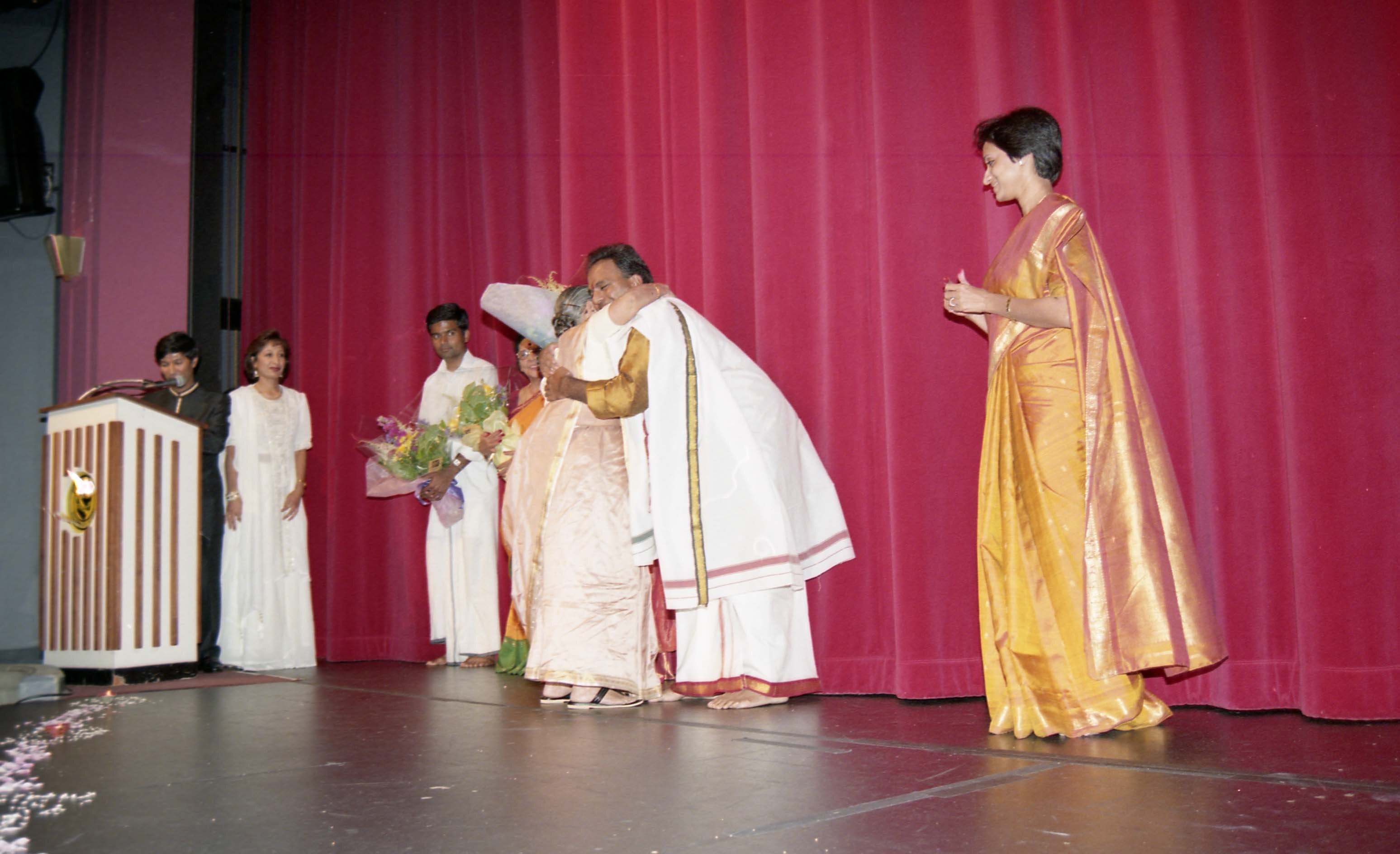 Photograph of a group of unidentified individuals onstage at Burnaby South Secondary School in British Columbia. Individuals had gathered for a dance recital presented by Sulochana Dance Academy.