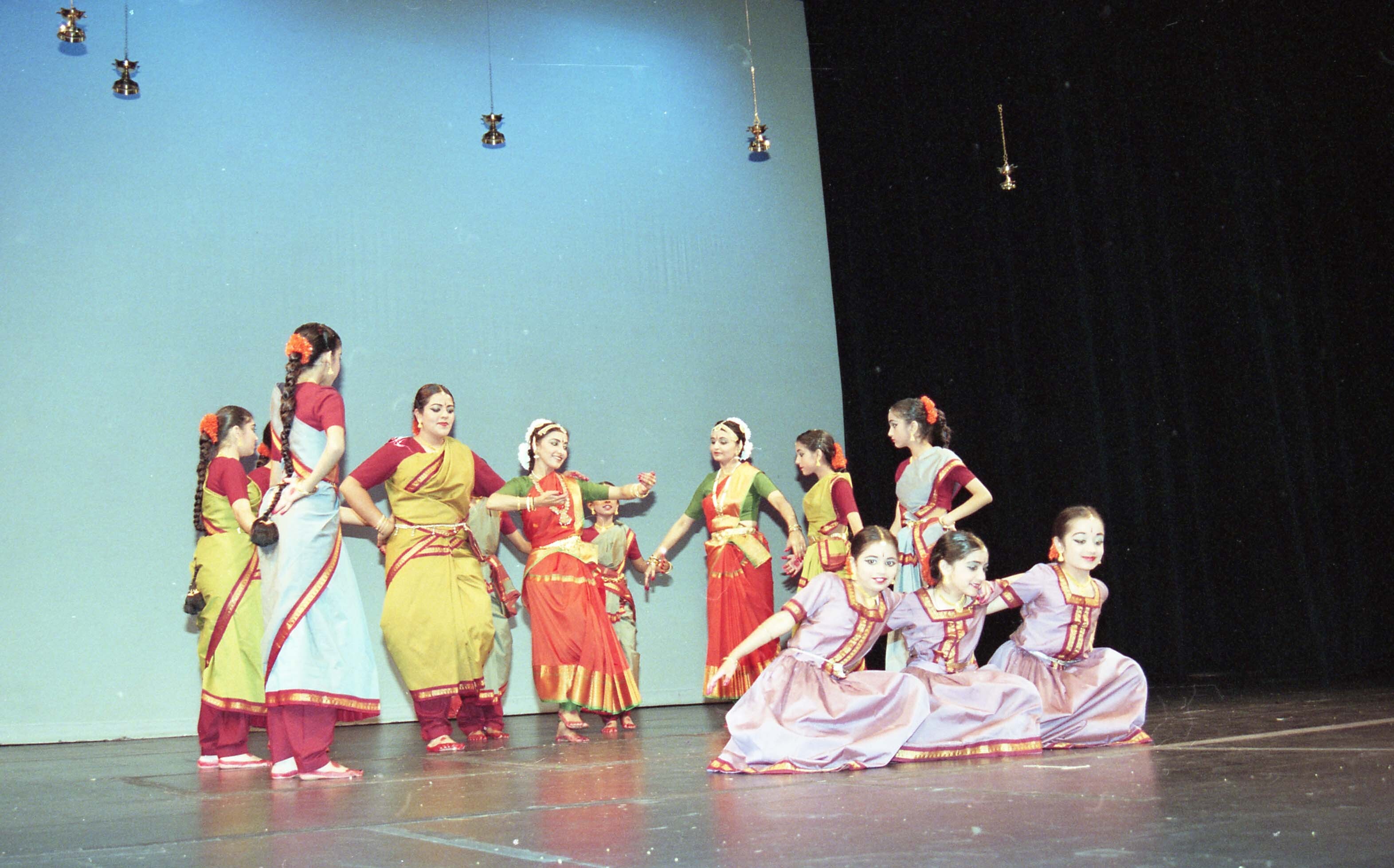 Photograph of an unidentified group of Bharatanatyam dancers performing onstage at Burnaby South Secondary School in British Columbia for a dance recital presented by Sulochana Dance Academy.