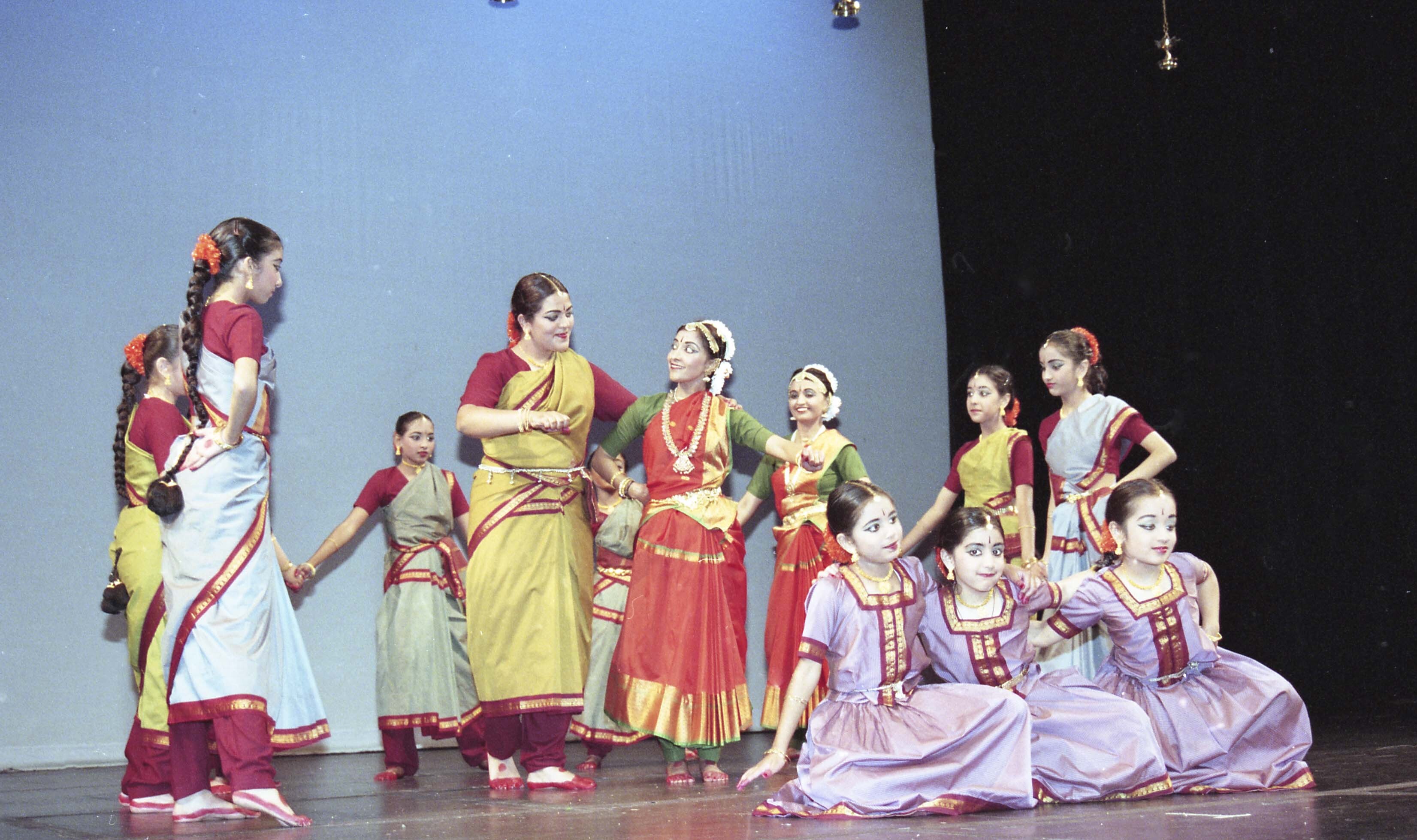 Photograph of a group of unidentified Bharatanatyam dancers performing onstage at Burnaby South Secondary School in British Columbia for a dance recital presented by Sulochana Dance Academy.