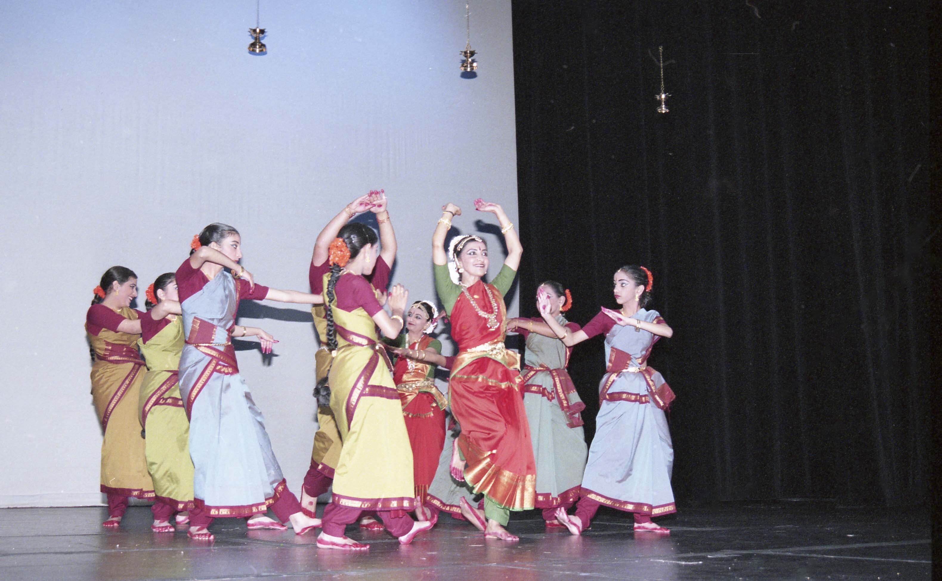 Photograph of a group of unidentified Bharatanatyam dancers performing onstage at Burnaby South Secondary School in British Columbia for a dance recital presented by Sulochana Dance Academy.