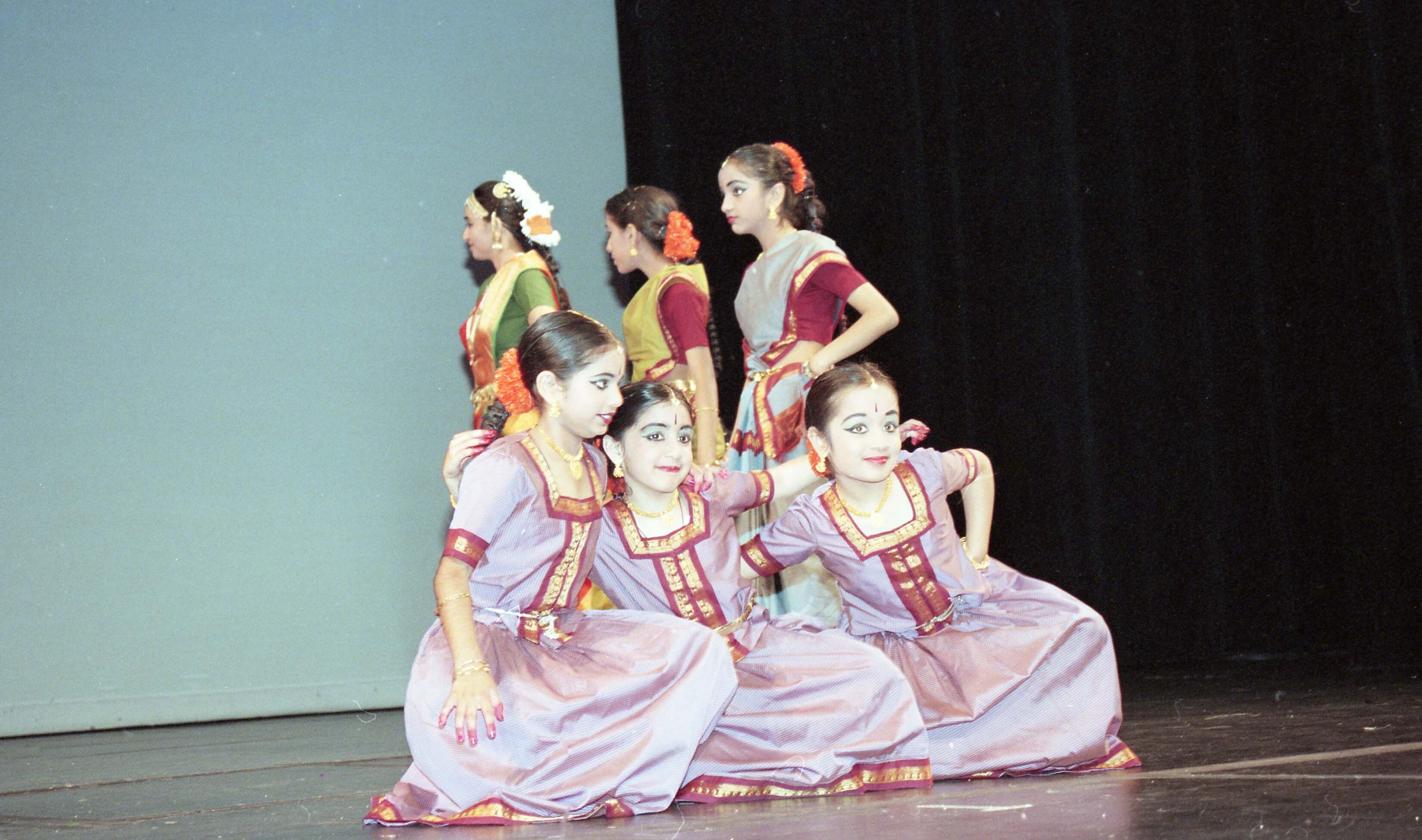 [Photograph of Bharatanatyam dancers performing onstage at Burnaby South Secondary School]