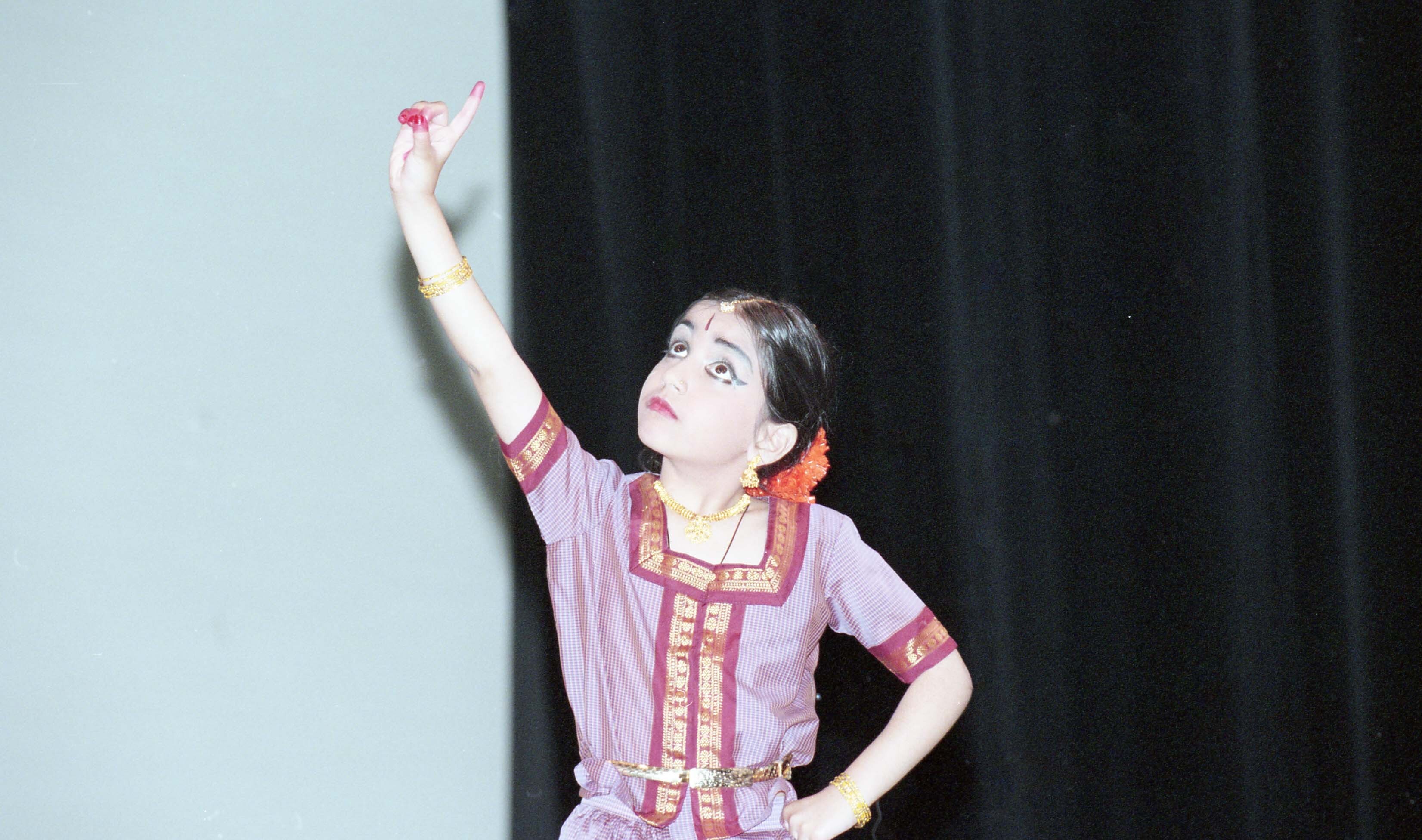 [Photograph of a Bharatanatyam dancer performing onstage at Burnaby South Secondary School]