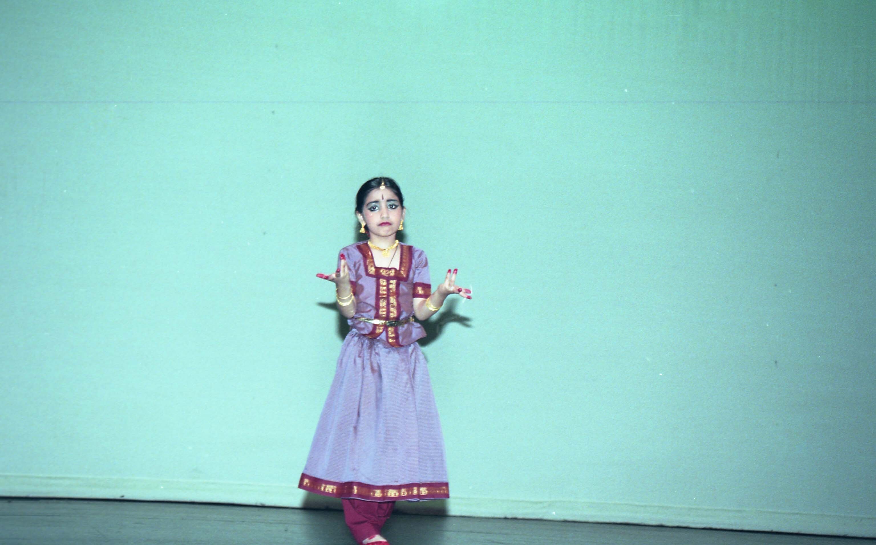 Photograph of an unidentified Bharatanatyam dancer performing onstage at Burnaby South Secondary School in British Columbia, for a dance recital presented by Sulochana Dance Academy.