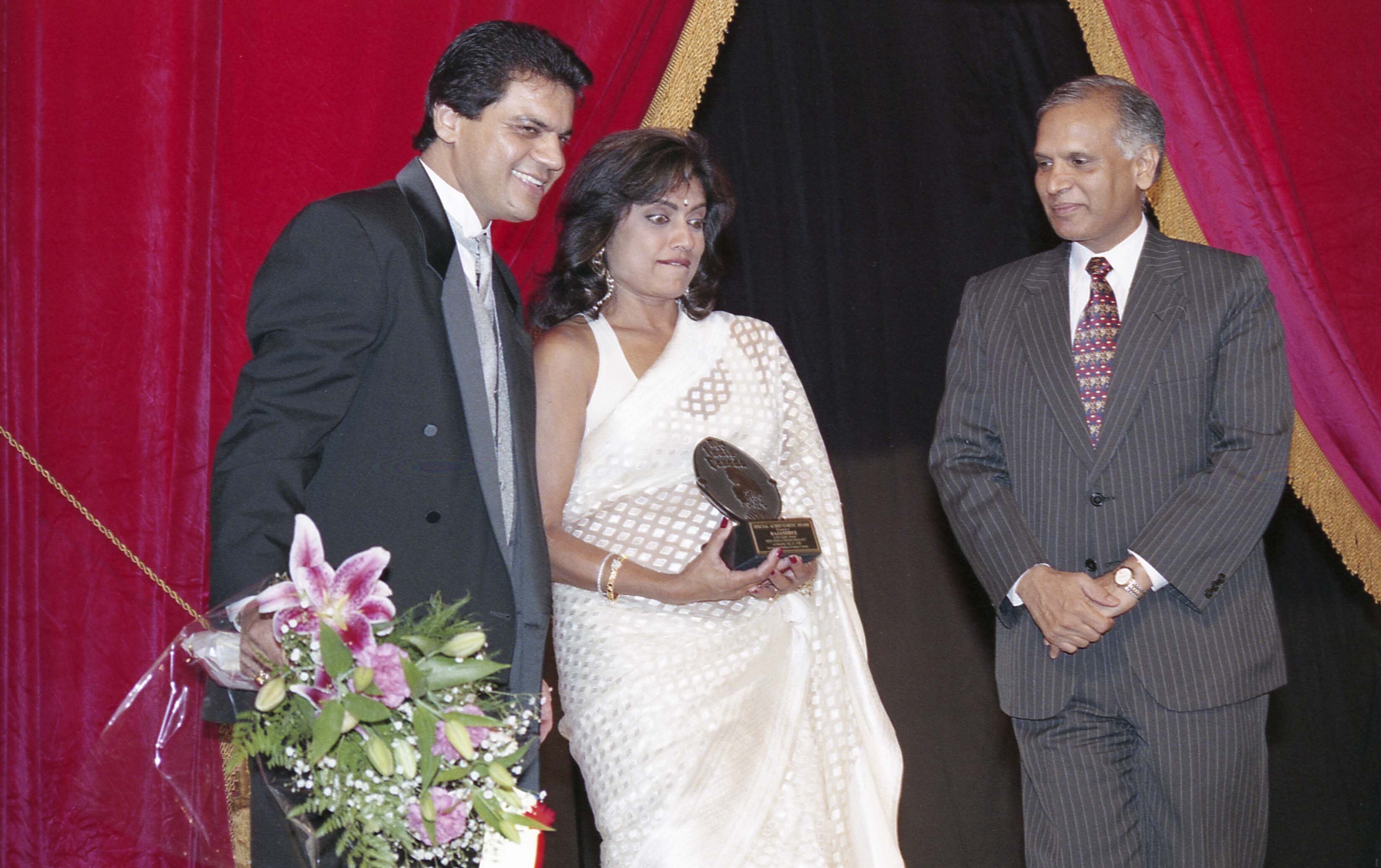 Photograph of unidentified individuals, one holding an award, at the Miss India-Canada beauty pageant held in Toronto, Ontario. The eighth annual beauty pageant was presented by Canada India Quest Inc.