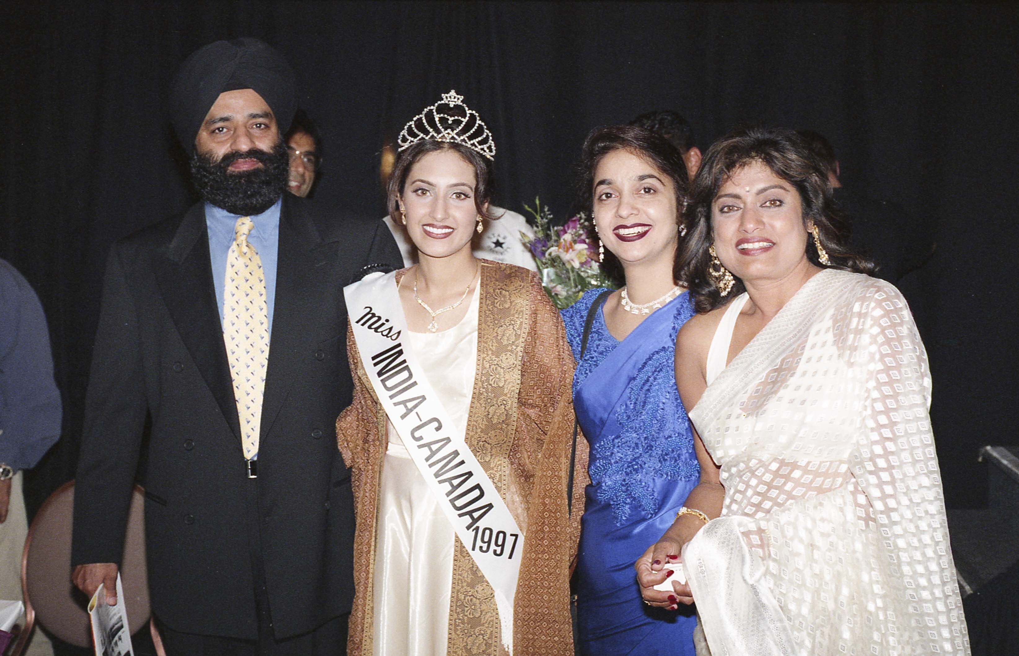 Photograph of Miss India-Canada 1997 with unidentified individuals at the Miss India-Canada beauty pageant. The eighth annual beauty pageant was presented by Canada India Quest Inc. in Toronto, Ontario.
