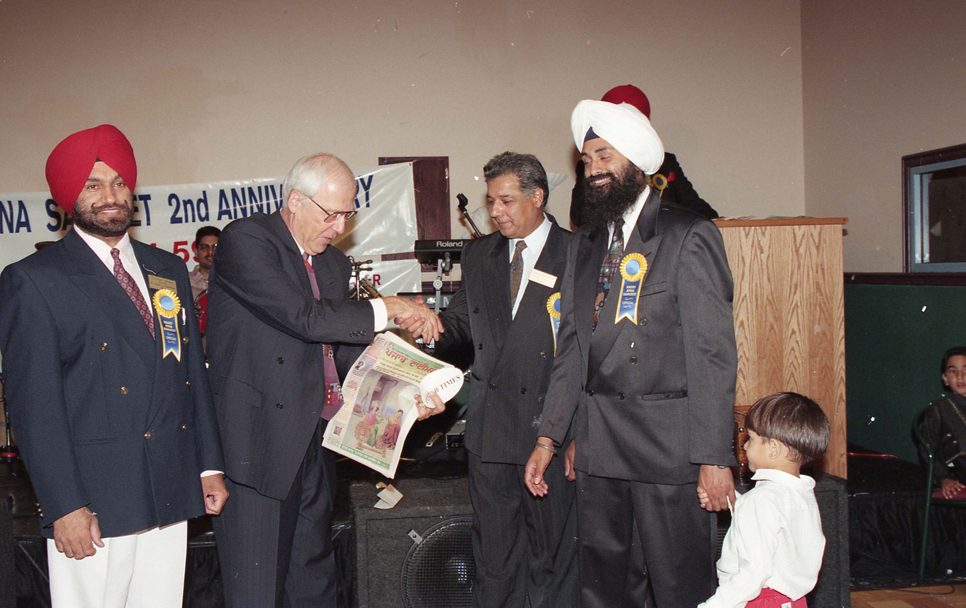 Photograph of a group of unidentified individuals at the second anniversary event for Radio Apna Sangeet, where the Punjab Times newspaper was unveiled. In attendance was Robert Bose, former mayor of Surrey, seen holding a newspaper with the title "Punjab Times".