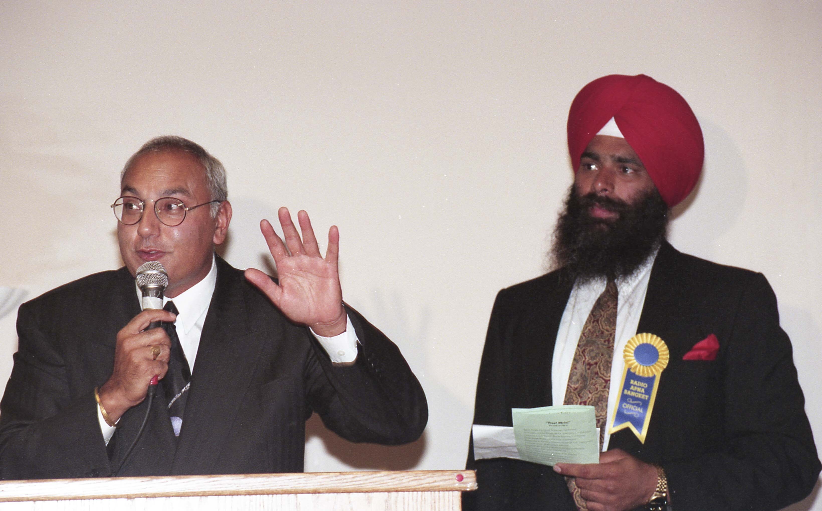 Photograph of Herb Dhaliwal, former cabinet minister, and an unidentified individual at the second anniversary event for radio apna sangeet, where the Punjab Times newspaper was unveiled.