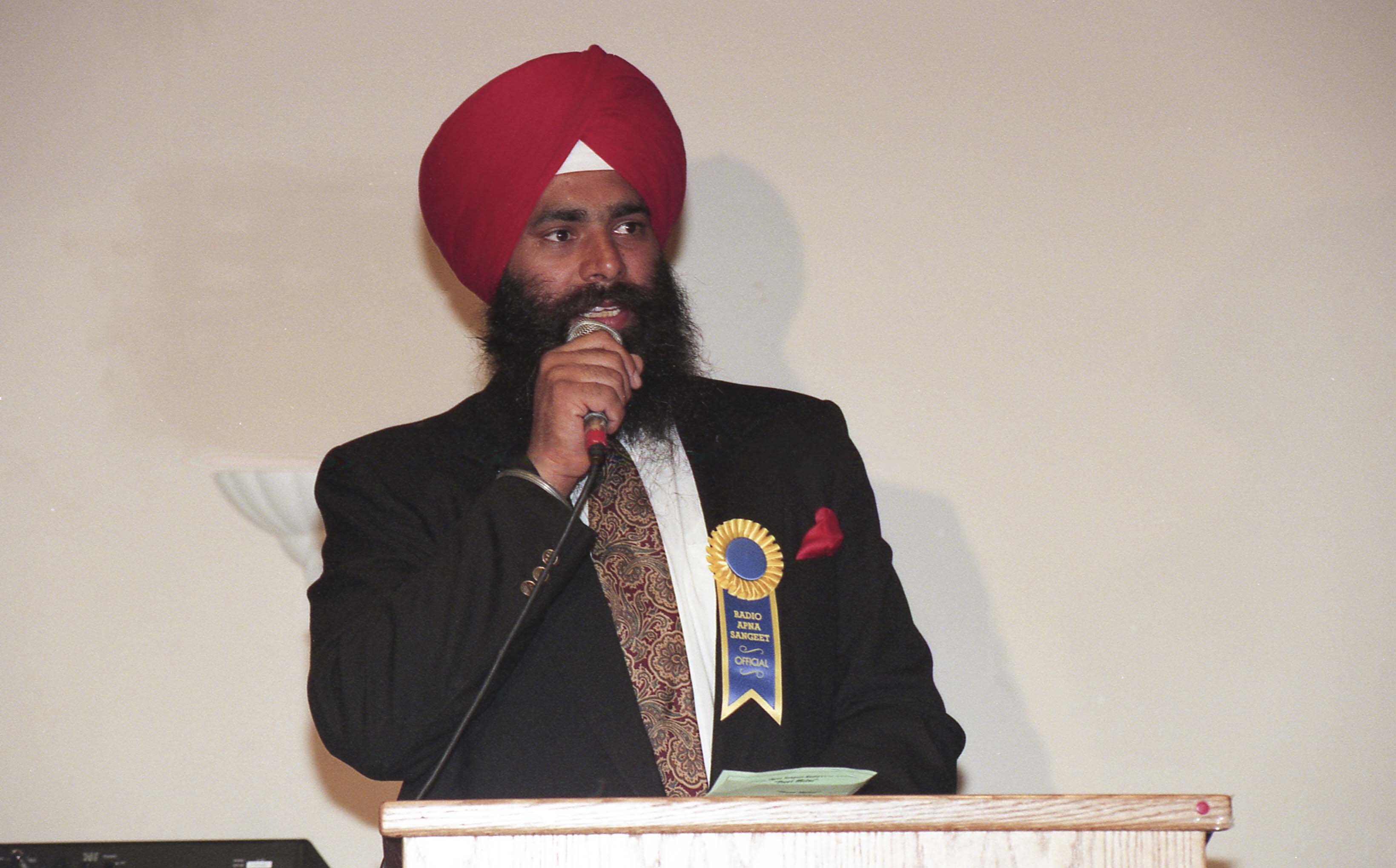 Photograph of an unidentified individual, an official from the Radio Apna Sangeet, at the second anniversary event for the radio where the Punjab Times newspaper was unveiled.
