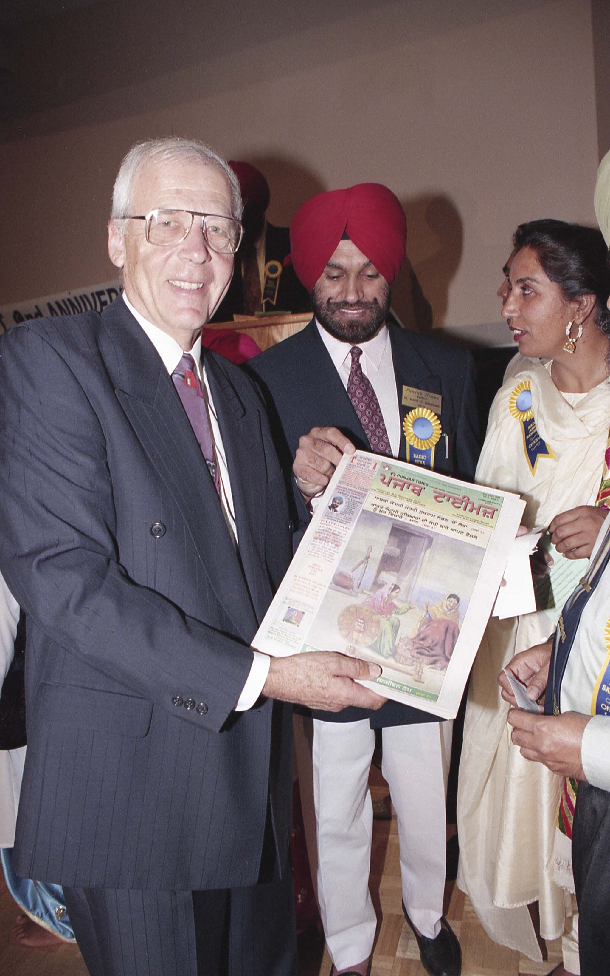 Photograph of Robert Bose, former mayor of Surrey, holding a newspaper, with unidentified individuals at the second anniversary event for radio apna sangeet, where the Punjab Times newspaper was unveiled.
