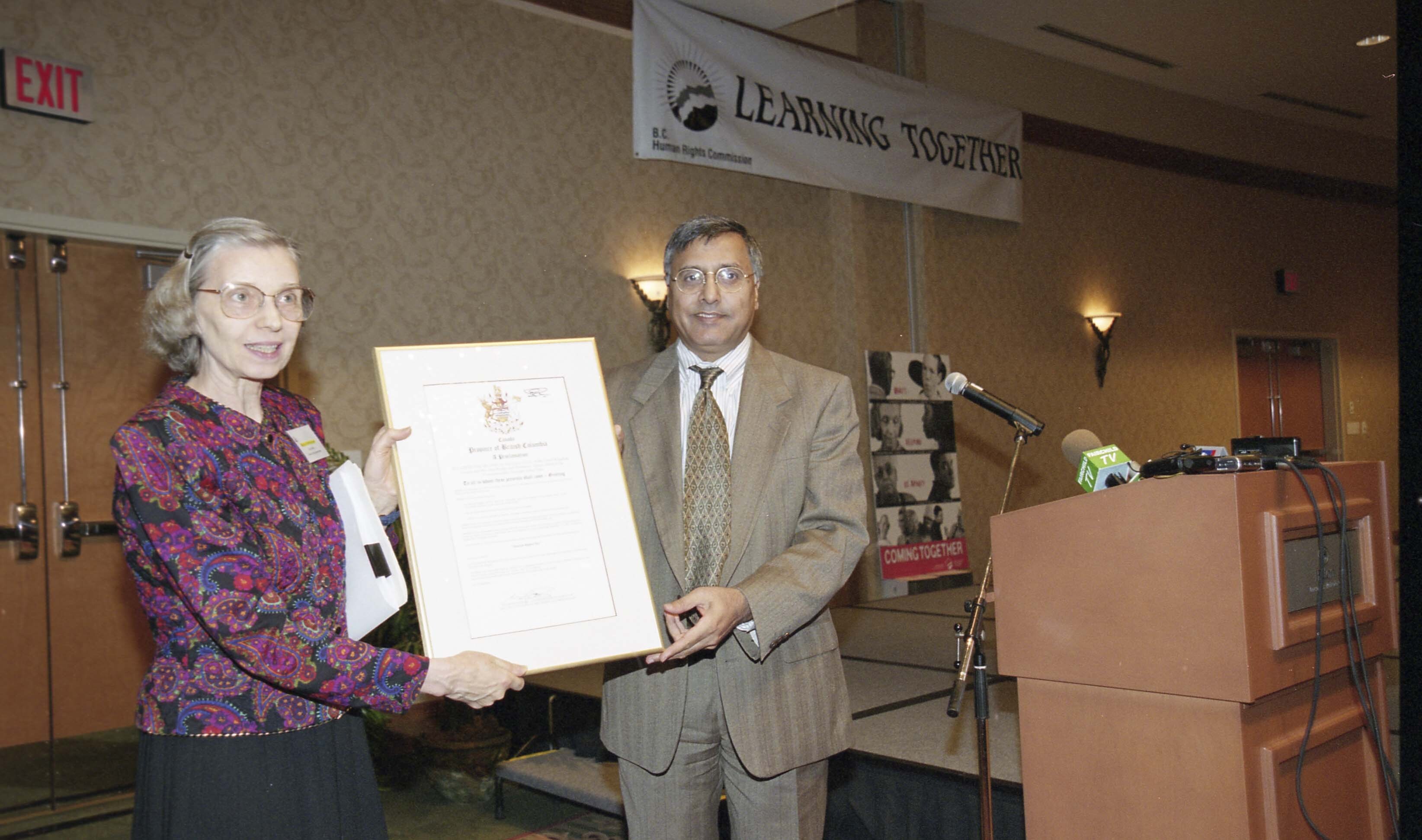 Photograph of Ujjal Dosanjh with an unidentified individual, holding a framed document[?], at the Learning Together event in Vancouver, British Columbia (B.C.). The event was hosted at the Hilton Hotel by the B.C. Human Rights Commission.